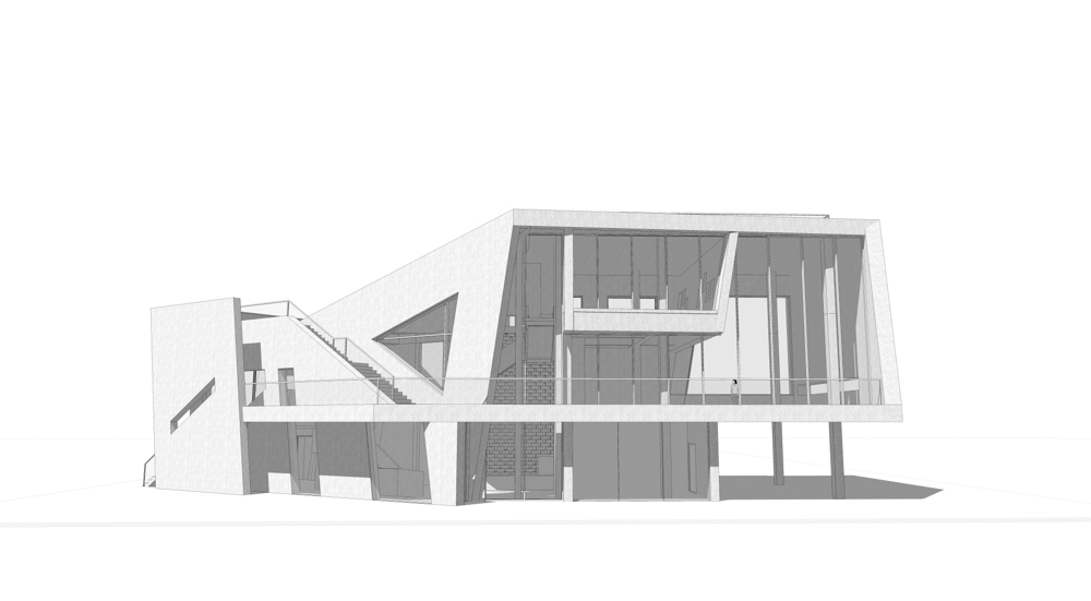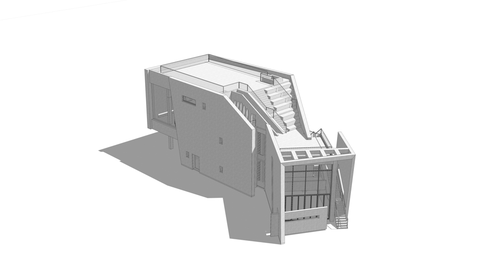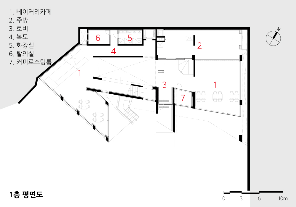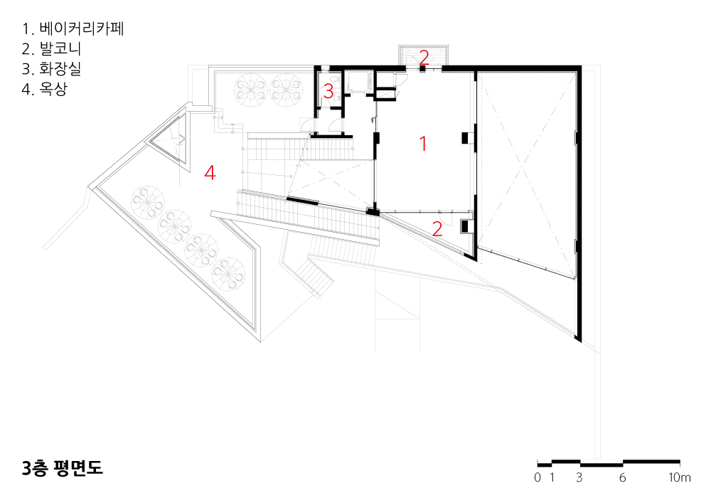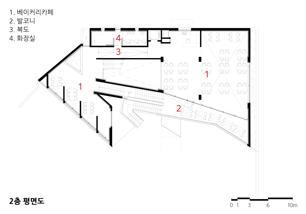 건축물을 경험하면서 편안한 자리에 앉아서 느끼는 경험도 중요했지만, 우리는 이동하면서 경험할 수 있는 입체적 건축물을 생각했다. 우선 두 개의 수직이동 동선을 설정하고, 하나는 외부에, 다른 하나는 내부에 설치했다. 이 계단들은 건축물의 전면에 배치시켜 카페로 들어오는 이용자와 카페에서 나가는 이용자들이 이동하면서 건축물과 주변풍경을 감상할 수 있도록 하였다. 그리고 전면에 적용한 여러 각도의 사선은 이동하는 이용자들에게 다양한 건축물의 모습을 보여주게 된다.
