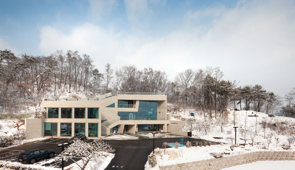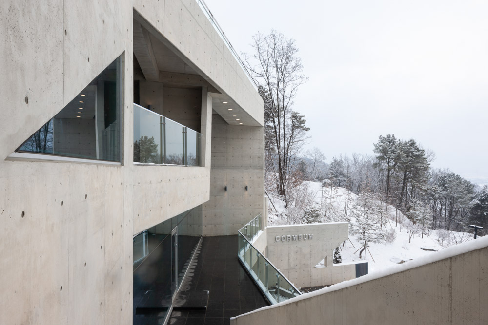 Cormeum is located at the southern foot of Bibongsan Mountain (229m) in Anseong. As we enter the small road from the main road of Bogaewonsam-ro, we gradually come to see the structure we saw. The first thing you can see is Bonacava, a café run by the client, which is located at the entrance of the site in the form of a long box from north to south, obscuring the "Cormeum". The scene slowly emerges until we reach this building and stay for a while. Then you start to see the Cormeum. It was designed with the hope that it would reflect the location characteristics of the site, which is gradually revealed, and make it an unpredictable architecture. To this end, the space and form were designed in a way that corresponds to the access road with different angles and levels. Of course, the angles and levels should simply reflect the view as an access road, the hierarchy of space, the program, etc.