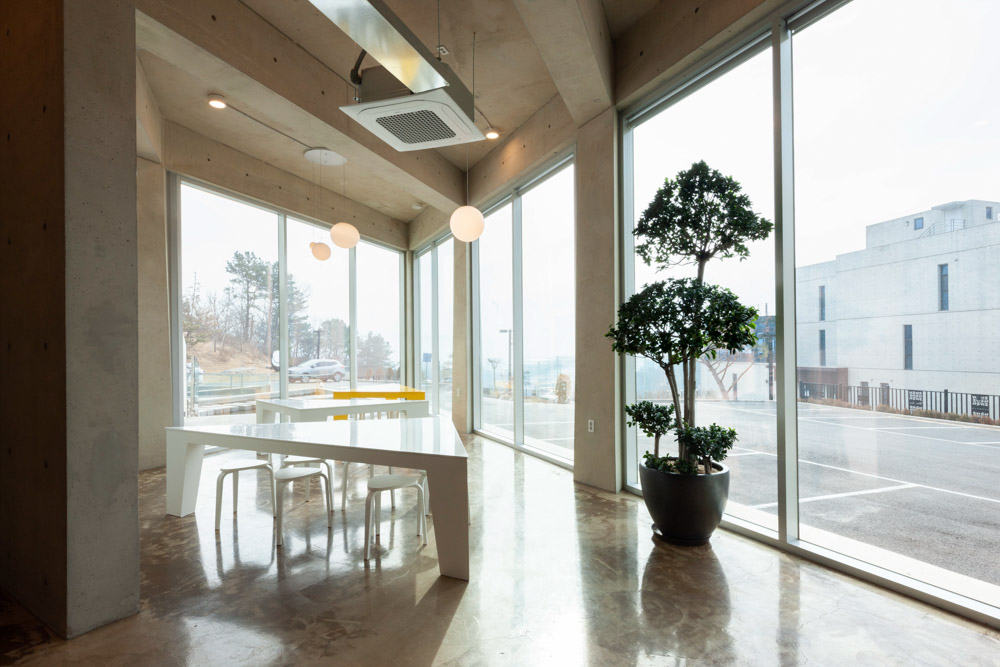 건축주는 예술가들과의 우호적인 관계를 지속해오고 있는 일종의 지역예술지원자라고 할 수 있다. 그래서 이 건축물에는 다양한 크기의 벽과 공간적 예술품을 전시할 수 있는 오픈 공간을 기획하였으며, 이동하는 동선이 이런 공간들과 연계되어 감상할 수 있도록 하였다. 그리고 테이블과 의자가 이동하는 동선과 연계 배치되어 이용자들의 취향에 맞게 선택할 수 있도록 하였다. 이는 반 셀프서비스의 최근 카페운영 방식을 고려한 배치이다.