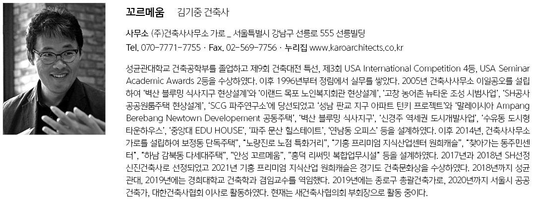 | 꼬르메움 설계자 | 김기중 _ (주)건축사사무소 가로 건축주 | 이종선 감리자 | 육용근 시공사 | 알브이엠종합건설 설계팀 | 조현용, 박재옥, 박영진, 김지혜, 김보하, 이현수 설계의도 구현 | (주)건축사사무소 가로 대지위치 | 경기도 안성시 보개원삼로 165-20 주요용도 | 제2종 근린생활시설(휴게음식점) 대지면적 | 4,525.00㎡ 건축면적 | 864.82㎡ 연면적 | 2,129.53㎡ 건폐율 | 19.11% 용적률 | 41.25% 규모 | 3F 구조 | 철근콘크리트구조 외부마감재 | 노출콘크리트 내부마감재 | 노출콘크리트, 에폭시, 수성페인트 설계기간 | 2017. 08 – 2020. 02 공사기간 | 2020. 09 – 2021. 09 사진 | 박명래 구조분야 : (주)지오이앤씨 기계설비분야 : (주)대명기술단 전기분야 : (주)대명기술단 소방분야 : (주)대명기술단 |