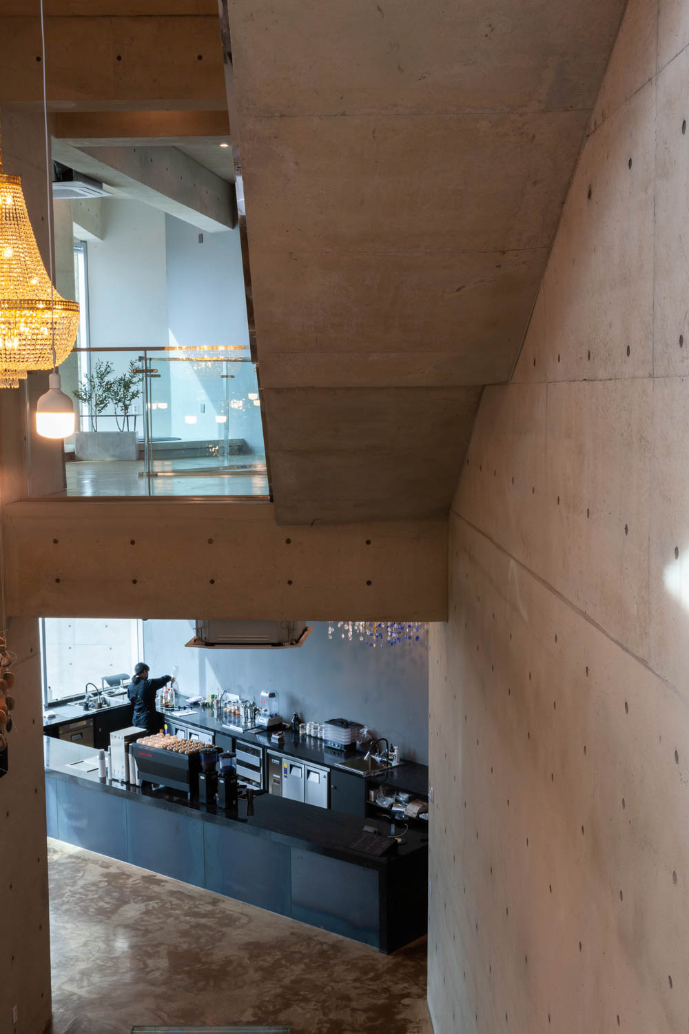 Continuous interior space of various heights of exhibition and cafe space
