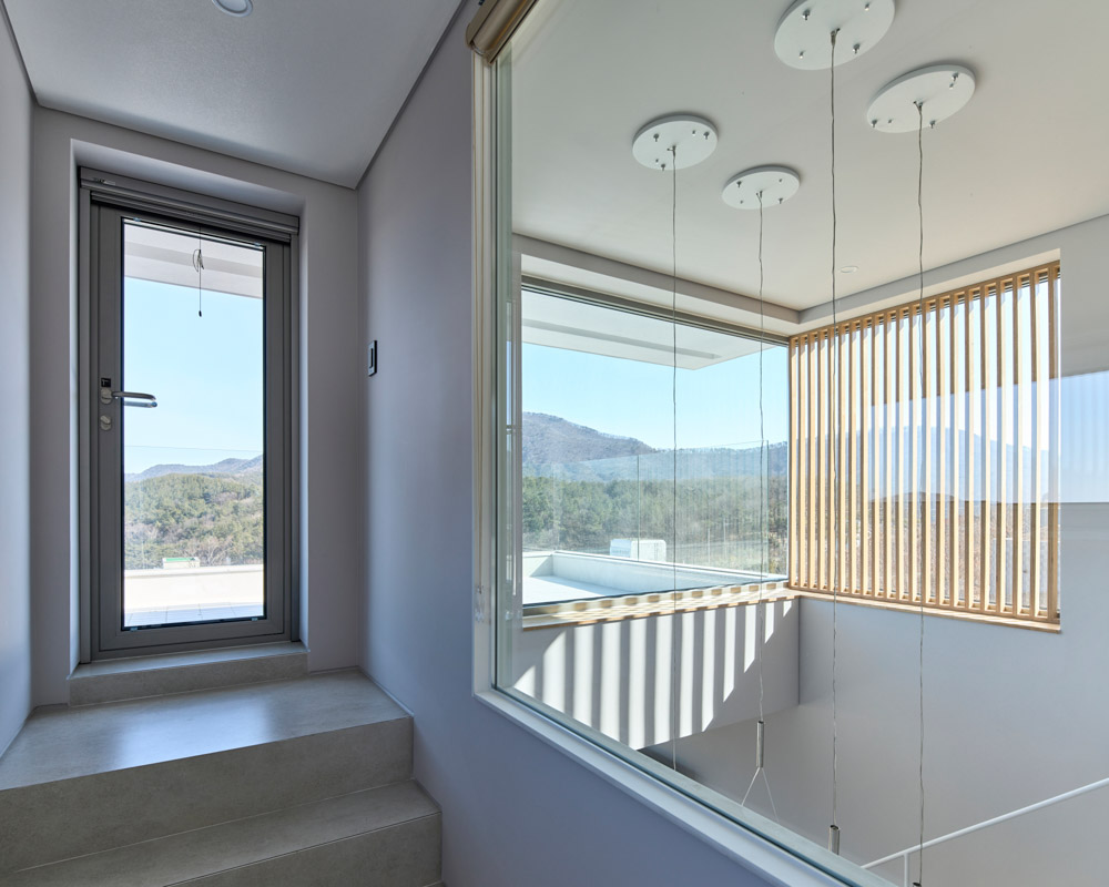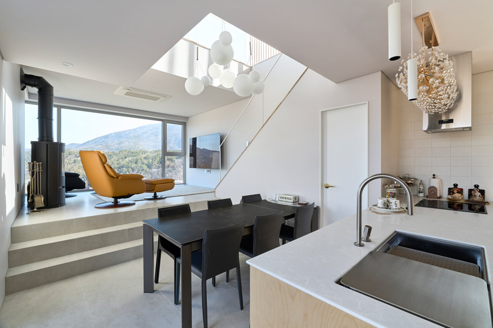 낮고 작은 집이라 가족의 중심 공간이 될 다이닝과 거실 공간만큼은 체적을 키웠다. 2층까지 비워진 공간에 쪼개진 빛을 들여 벽에 새기니 순백의 공간에 활기가 돈다. 거실의 북동쪽 면은 전체가 창이다. 국수봉을 눈앞까지 끌고 오지만 향 덕분에 직사광선의 영향은 적어 편안한 빛을 들인다.