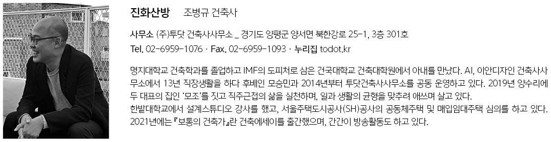 건축주가 조심스레 꺼낸 이름에서 집이 존재하는 의미는 바로 드러났다. ‘산방’에선 집이 고졸하기를 바라는 마음을 읽었고, 건축주 부모님의 이름 한 글자씩을 따온 ‘진화’에서는 부모님과 함께였던 유년의 추억이 이 집을 통해 가족들에게 공유되길 기대하는 마음을 엿볼 수 있었다.