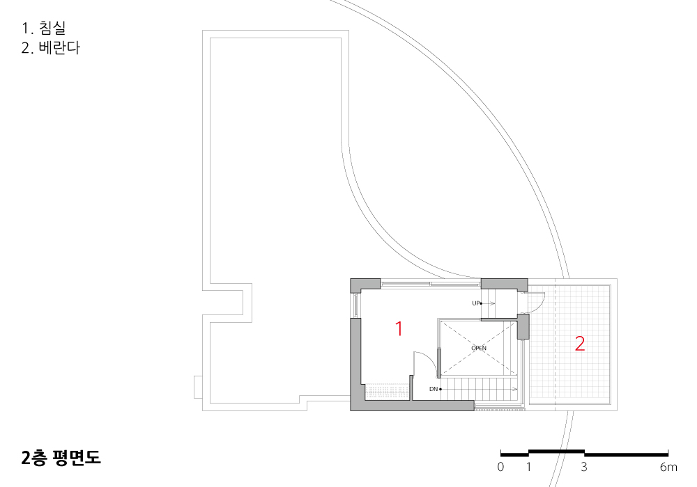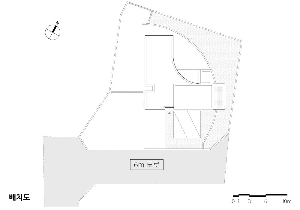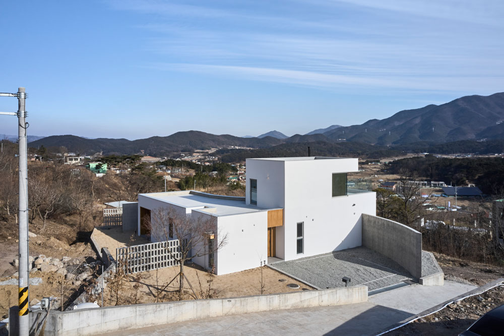 그래서 L자 형태의 작은 집에 반원의 가벽으로 마당을 한정했다. 반원의 콘크리트 가벽은 기존 콘크리트 축대와 집을 연결시키는 장치이자 가족만의 내밀한 마당을 제공한다. 바라던 은신처이다. 마당에는 야외 욕조가 있고 나무 한 그루가 그림자로 벽에 그림을 새긴다. 국수봉의 펼쳐진 능선을 잘 담아낼 위치에 가벽을 뚫고 가벽 너머의 산과 마당과 집안의 윈도우시트를 겹치게 했다. 생활의 모습과 풍경이 잘 섞이고 삭아서 발효된 풍경, 무르익은 장소로서 의미를 가지길 바라본다.