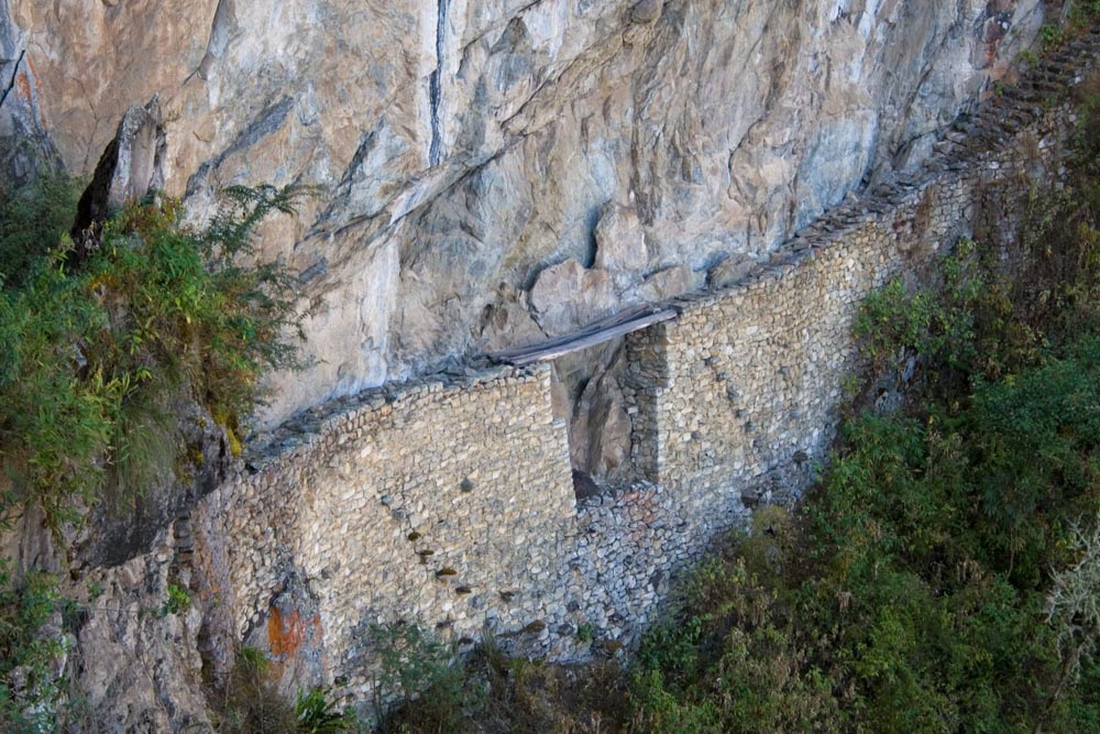 열 개의 출입문이 있는 벽, 서남쪽 사면으로 난 비탈길을 따라 내려가면 아찔한 절벽에 걸린 도개교가 나온다. 잉카의 길은 항상 열려 있지만 마추픽추 요새에 아무나 들어갈 수 있는 것은 아니었다. 마추픽추로 통하는 굴과 다리는 하나같이 유사시 적의 침입을 막는 방어 수단이었다. 마추픽추 남서쪽 절벽 허리에 잉카의 길이 아슬아슬하게 걸려 있다.