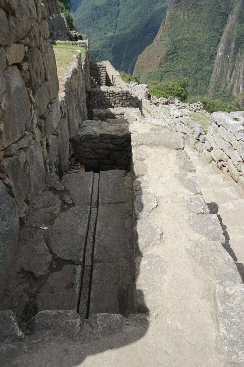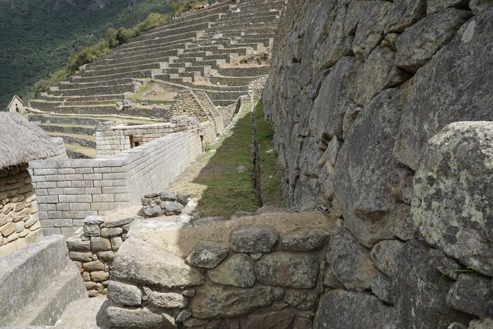 조금만 신경 쓰면 남쪽 테라스에 정성 들여 만든 물길이 해자를 건너 마추픽추 요새 안으로 안전하게 흘러드는 것을 발견할 수 있다. 약 3도의 경사를 이루고서 물이 넘치지도 않고 바닥으로 누수 되는 것까지 고려하여 지속적으로 흘러 의식센터까지 이르게 하는 데 성공한 것이다.