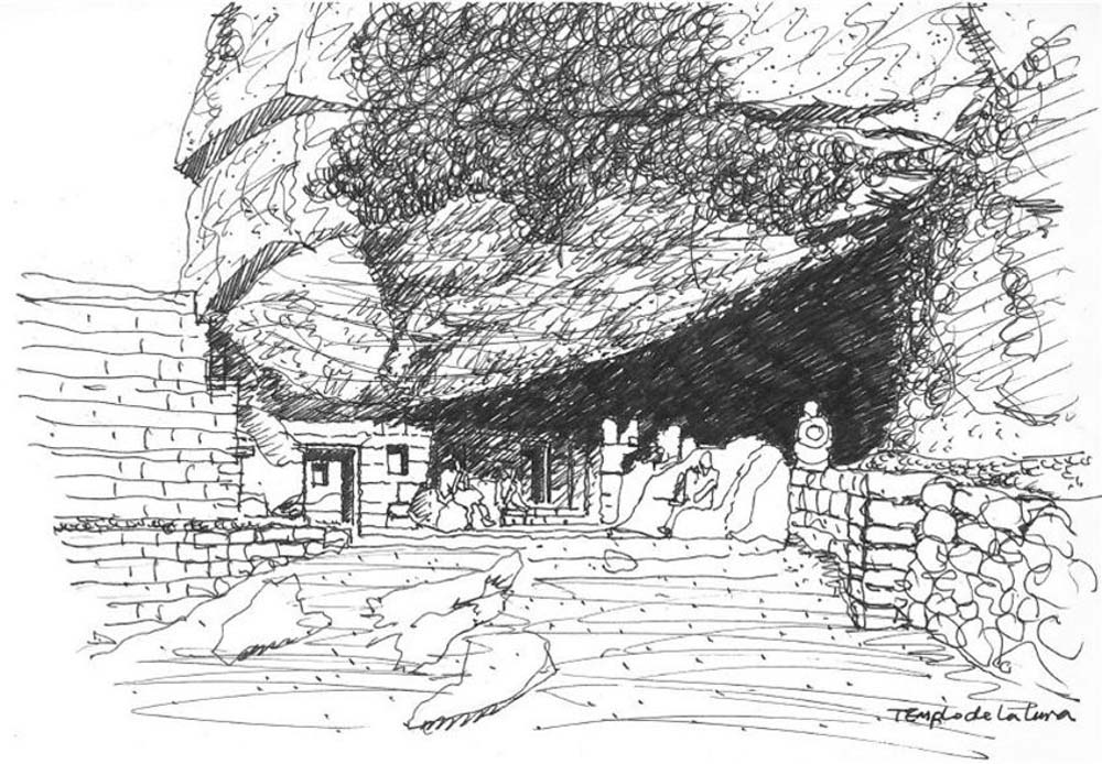 산비탈에 박혀 있는 거대한 둥근 바위를 발견한 잉카인은 그 바위의 생김새에 걸맞게 동굴 신전을 만들고 지상에는 부속실을 마련해 그들의 신을 불러들였다. 동굴 안에 잘 짜여진 블록이 돌 사이를 어눌하게 결속하며 천장의 곡선미를 완성한다. 내부 벽에 정교하게 장식된 사다리꼴 벽감조차 자연스러운 것은 아름다운 곡선 천장과 조화를 이루기 때문이다.