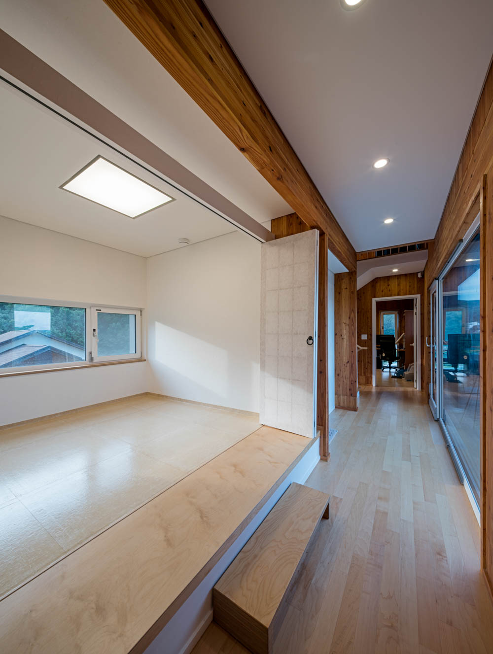 2 건축구법 상 국내 전례 없었던 CLT를 구조와 실내마감으로 쓰자는 것 외에는 여느 건축과 다르지 않았다. 은퇴 후 노년을 보낼 집이기에 라이프스타일을 존중한 공간을 만들어야 했고, 건축주의 사회적 비중과 활동을 고려하자면 가족공간과 응접공간의 구분이 필요하다고 여겼다. 마치 옛집의 사랑채와 같이 안채의 프라이버시를 위한 채 나누기를 했다. 사적공간과 다소 공적인 거실공간을 현관을 중심으로 좌우로 분리시킨 후 복도로 연결했다. 두 개 층으로 구성된 안채와 높은 층고의 단층거실이 병치되며 맞배지붕과 평지붕의 결합으로 공간의 다양함을 만들었다.