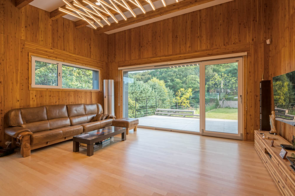 2 It was no different from any other architecture except for using CLT as its architectural structure and interior finish, which was unprecedented in Korea in terms of architectural structures. Since it is a house in which the client will spend his old age after retirement, it was necessary to create a space that respects lifestyle and to separate family space and reception space, considering the client’s social importance and activities. Like Sarangchae(detached house) of an old house, anchae(main house) was separated for privacy. The private and public living spaces were divided into left and right sides from the entrance and then connected to the hallway. A two-story main house and a single-story living room with a high ceiling are juxtaposed to combine a gable roof and a flat roof, creating various spaces.