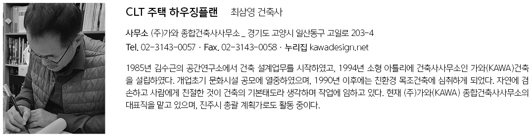 1 설계 의뢰인은 서울대학교 농업생명과학대학에서 후학들을 가르치고 한국 목재계의 숱한 인재를 길러낸 학자다. 은퇴 후 기거할 집 설계를 의뢰하면서도 가족들이 살 집을 CLT(면상 적층 구조재) 연구 프로젝트로 스스로 임상을 자처하며 많은 시간을 연구에 투자해 주셨기에 설계자는 편안히 집의 기능과 형태를 구법에 맞추고 조율하는 일만 했다. 건축주와 목조전문시공사 스투가, 그리고 설계자인 가와건축은 오래토록 신뢰를 쌓아온 사이다. 나름 일찍 조를 짜둔 것이다. 설계에 앞서 우리보다 앞서 CLT제작과 공사를 실천한 일본시장을 답사하며 호흡을 맞춰 나갔다. 스투가는 가와건축과 일찍이 많은 프로젝트를 같이 수행하며 손발을 맞춰온 회사이며 국내 목조의 새로운 구법에 헌신적 참여를 많이 해온 내공 깊은 회사다.