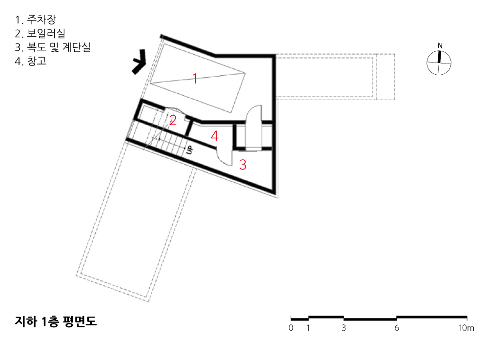 3 의뢰인 가족이 건축설계를 함에 있어서 두 개의 목표를 가지고 시작했다. 하나는 그간 살아온 공동주택의 삶의 형태와 단독주택만의 장점을 잘 어우러지게 해 보자는 것이고, 하나는 그간 많이 봐온 판넬 방식의 구법이 아닌 CLT를 사용한다는 것에 있다. 건축 조형은 구법에 최적화된 단순한 형태가 맞을 듯했으나 건축주에게 너무 단순한 조형으로 설득시킬 자신이 없었을뿐더러 처음 해보는 CLT구법의 가능성을 다양하게 관찰해볼 욕심도 없진 않았던 것 같다.
