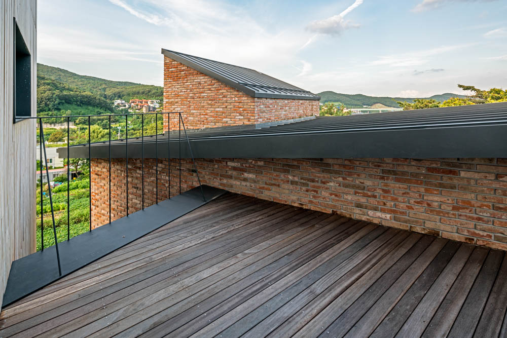 2 It was no different from any other architecture except for using CLT as its architectural structure and interior finish, which was unprecedented in Korea in terms of architectural structures. Since it is a house in which the client will spend his old age after retirement, it was necessary to create a space that respects lifestyle and to separate family space and reception space, considering the client’s social importance and activities. Like Sarangchae(detached house) of an old house, anchae(main house) was separated for privacy. The private and public living spaces were divided into left and right sides from the entrance and then connected to the hallway. A two-story main house and a single-story living room with a high ceiling are juxtaposed to combine a gable roof and a flat roof, creating various spaces.