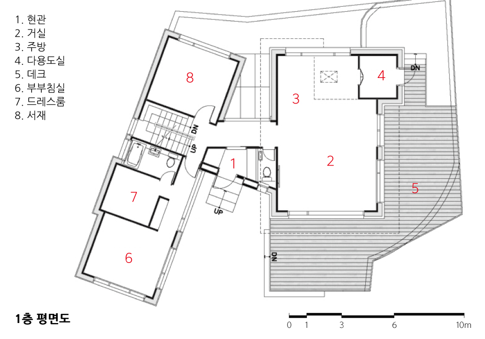 6 사적인 공간과 공적인 공간의 적절한 이격을 했으며, 거실은 외부의 테크와 연결시키며 테크는 집과 숲 사이에 오붓한 외부 거실 역할을 하게 했다. 노후생활을 대비하여 1층에 부부침실과 서재를 두었으며, 2층에는 자녀공간을 배치했다. 계절 짐을 두기 위한 다락을 지붕경사를 적절하게 이용하여 만들어 공간의 다채로움을 만들었으며, 외부조망과의 관계를 위한 창들을 공간의 결절점마다 두었다.