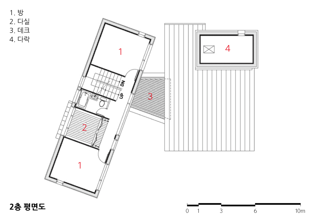 2 건축구법 상 국내 전례 없었던 CLT를 구조와 실내마감으로 쓰자는 것 외에는 여느 건축과 다르지 않았다. 은퇴 후 노년을 보낼 집이기에 라이프스타일을 존중한 공간을 만들어야 했고, 건축주의 사회적 비중과 활동을 고려하자면 가족공간과 응접공간의 구분이 필요하다고 여겼다. 마치 옛집의 사랑채와 같이 안채의 프라이버시를 위한 채 나누기를 했다. 사적공간과 다소 공적인 거실공간을 현관을 중심으로 좌우로 분리시킨 후 복도로 연결했다. 두 개 층으로 구성된 안채와 높은 층고의 단층거실이 병치되며 맞배지붕과 평지붕의 결합으로 공간의 다양함을 만들었다.