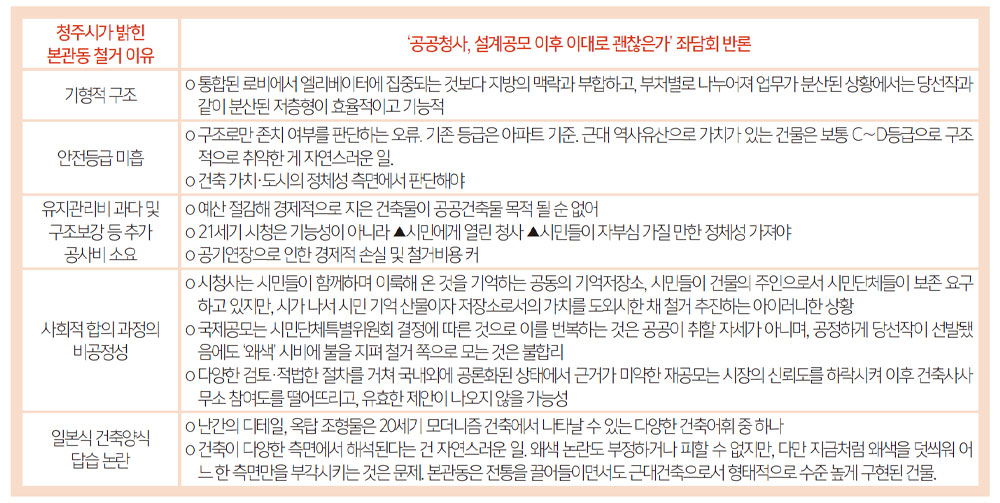 안창모_본관동을 보존하며 신청사를 짓기 위한 초기 논의에 조금 관여한 적이 있는데요. 이미 당시에 이것이 왜 보존돼야 하는지와 보존하면서 설계공모가 이루어질 때 갖는 장소성에 대한 논의가 신중하면서도 충분히 진행됐습니다. 그런 것들이 모두 반영돼서 최적의 안을 선택했는데, 그것들이 일순간에 가치를 잃게 되는 과정에서 철거론자들이 말하는 핵심 논리가 왜색을 띠고 있다는 것과 가치 판단이 잘못됐다는 두 가지 부분인데요. 왜색 시비 논쟁에 언급되는 난간의 디테일이라든지 옥탑의 조형물 같은 것들은 사실 20세기 모더니즘 건축에서 나타날 수 있는 다양한 건축 어휘 중 하나라고 할 수 있거든요. 그런데 어떤 특정 부분들이 유사하다는 특이점이 있다고 해서 전문가 단체, 전문가들과의 논의나 검증철차 없이 일방적으로 최종 결론까지 이르렀다는 것은 문제를 제기한 사람의 무책임한 행동이었다고 생각합니다.