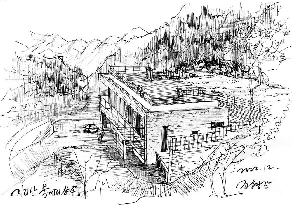 지리산 굽이굽이 고갯길을 한참이나 돌고 돌아 집 앞 진입로에 막 들어서면, 눈앞에 ‘less is more’ 마치 미스의 미니멀리즘 건축철학을 연상시키는 듯한 담백한 건축물 하나가 간결하고 심플한 아름다움을 보여주며 산허리 자락에 적절히 스며들어 있다. 무심한 직육면체는 경사지에 순응하며 대지 속을 파고들듯 더욱 깊숙이, 그리고 나지막이 자세를 낮추고 있다. 오랜 이웃인 윗집과 옆집의 채광과 경관을 가리지 않게 하기 위함이기도 하다. 이런 정겨운 배려가 시골 자연 속에서 모더니즘 형상이라는 어울리지 않을듯한 이질감마저 말끔히 희석해버린다.
