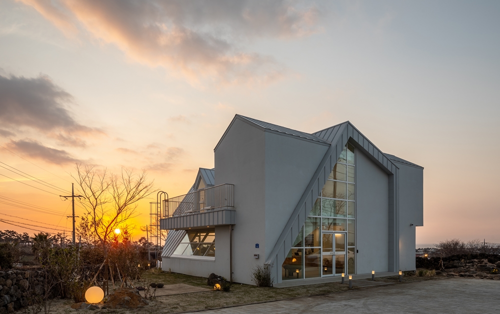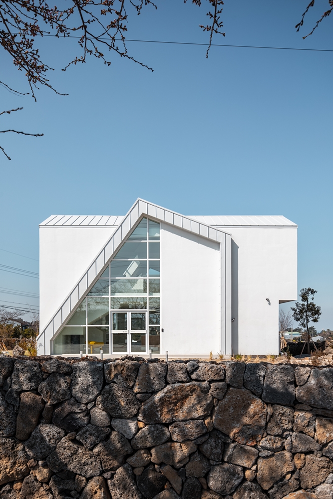 There was something special when I first saw the site. The open plain spread out on a pleasant hill, and the sea approaching from a distance, and Biyang Island spread out on one side like a scene in the picture. As if standing at the boundary between life and death, there were various traces on this site. Also, stone walls were made of basalt that had been neglected for a long time, tombs made of stones that had been abandoned for a long time, and traces that had been used as fields. It was the moment I felt the time the site has. It is a site where four roads intersect. The scenery itself was good, and the sea's view at the end of a hill where I could catch a glimpse from a car made me excited. And the location of the natural stone in the site was coincidentally good, so it seemed that the building's location was naturally determined. It is currently being used as part of landscaping. I still think it was a good idea that the existing traces could be a part of the architecture.