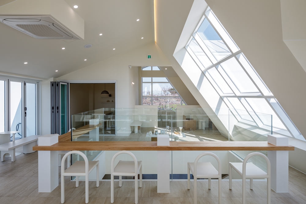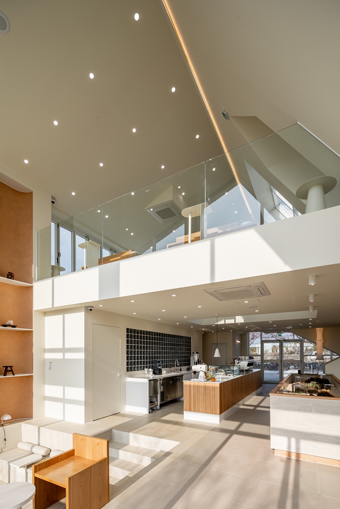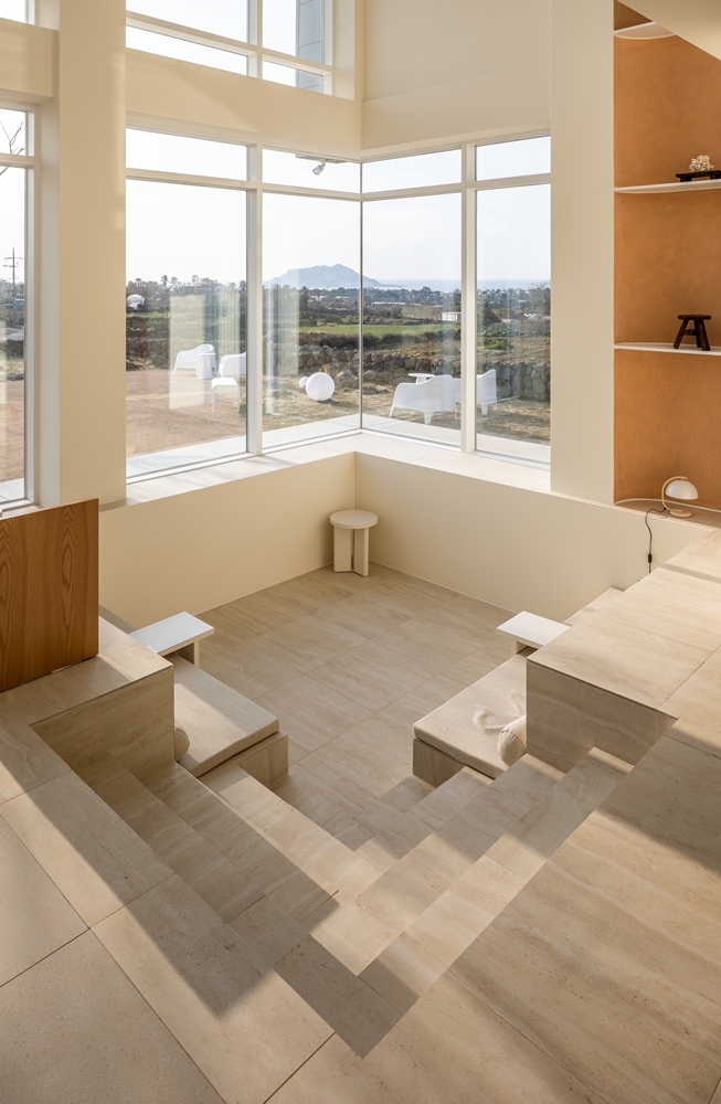 I wanted to create a space where people can focus on looking and “borrowed scenery”. The weakness of this site is that the sea of Jeju Island is a little far away. How to overcome this? So I wanted the place and the sea to become one space. At first, I thought of one-story, but I wanted to create a different landscape through the vertical movement flow line. Various and three-dimensional sceneries unfolded depending on the different gazes. I thought it would be nice to create a space that young people like even with the difference in the eye's height.