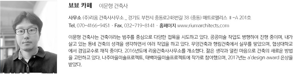 I tried to create a space to empty and fill, to give various spatial meanings in this small space. The proper spatial layout of void & solid is better for attracting the surroundings' shape and beauty and providing pleasure to those who stay.