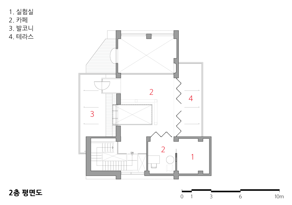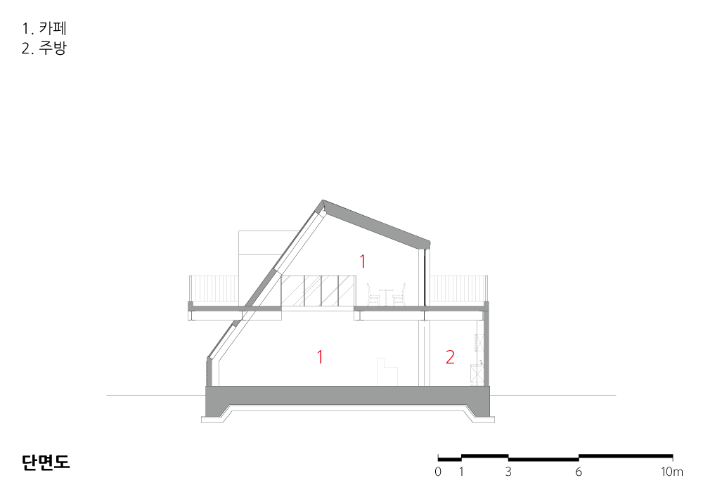 사선의 경계는 아래보다 위를 열어주는 기능을 한다. 하늘 등 외부로의 시선을 유도하기 위한 건축적 장치다. 수직적으로 봤을 때 하늘 공간이 더 열리는 것처럼 보인다. 보통의 도시에서는 수직적으로 일정한 공간을 가지고 있어 건축물의 용적만큼 하늘이 가려지게 된다. 이 카페는 위로 갈수록 공간을 덜 점유하는 형태라, 테라스에서 있을 때 좀 더 개방감을 준다.