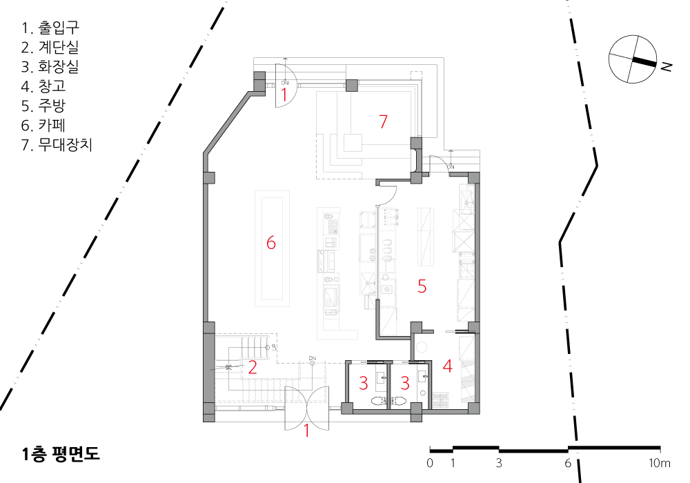 As I regard a small café as a space of experience, I aimed to make various areas. It contains various stories by securing the site's continuity by leaving the presence of the existing site while ground level. The story gets more in-depth with a view through a window, a terrace with the wind, a sky from minus space, a space of peeping through a small window, an open space with a vertical opening, a viewpoint secured with the absence of columns, and the power of space through indirect filtering of two large windows.