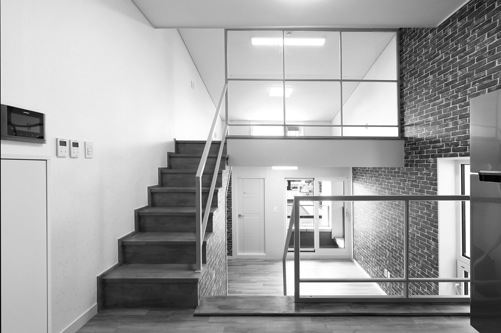 We maximized the usability by using various heights in level, in order to overcome the constraints of the building’s layer limit, 9m height limit, and also sloped road facing the site. Use of the building was approximately divided by layers. First floor of the building was planned to be a gallery and a cafe. Client couple wanted a home on the second floor. With the rest of the area our company suggested profitable one room. The living room and the kitchen of the house was arranged at the road side to have a Beom island view. Also the frame of the window was designed with minimized thickness of frame to capture the grandeur of the view. One room planned in consonant space was planned as a skip floor double decked attic structure to make a interesting space by seperating human flow in a vertical way.