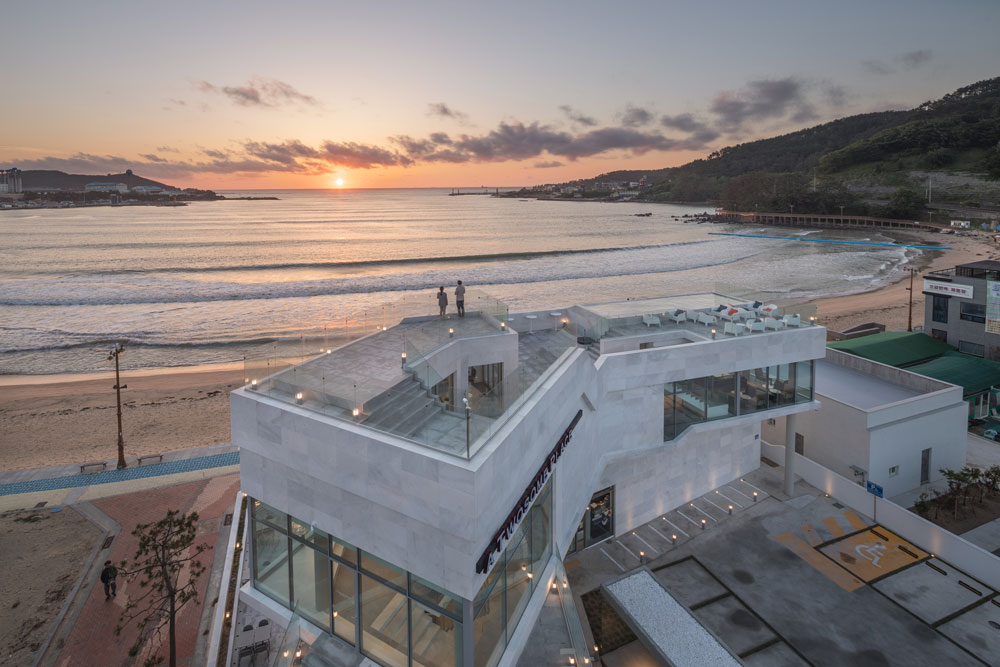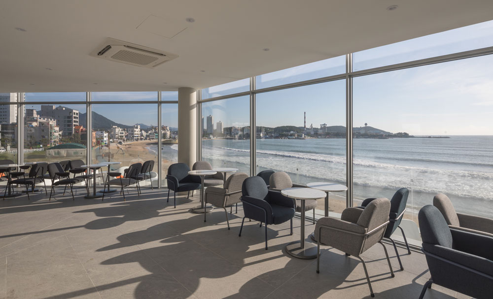 바다 쪽은 월파를 막기 위한 낮은 담장 사이로 테라스를 지나 진입하게 되는데, 매장-테라스-바다로 연결되는 시선의 개방 외에는 다른 공간적 장치가 없다. 건축도 매스의 어긋남은 인지되지만 삼면을 유리로 처리해서 공간의 볼륨감도 평면적이다. 바다로 열려진 내부공간을 수평으로 구분하는 굵은 띠가 공중에 떠 있을 뿐이다.