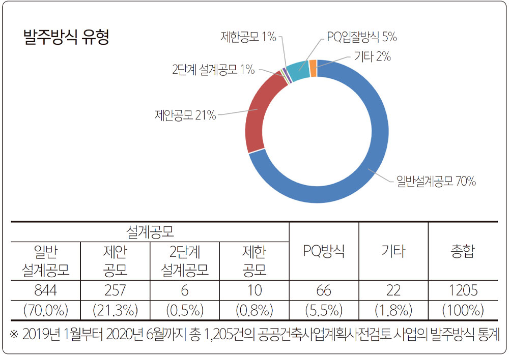 공공건축물은 지역 주민들의 삶의 질과 직접 연결되어 지역의 자부심을 형성하는 정책자산으로 좋은 설계자 선정을 위해 설계 품질로 경쟁하는 설계공모 제도가 「건축서비스산업 진흥법」이 제정된 이후 지속적으로 강조되고 확대되고 있는 추세이다. 2019년부터 2020년 6월까지 1,205건의 공공건축 사업의 발주방식으로 보더라도 전체의 1,117건(92.6%)이 설계공모방식을 통해 발주가 되고 있다. 하지만 2014년 「건축서비스산업 진흥법」 시행 이후 그간의 건축 설계발주 현황에 대한 전반적인 진단은 이루어지지 않았다. 또한 「건축서비스산업 진흥법 시행령」 시행(2020.1.16.)으로 설계공모 우선 적용 대상이 대폭 확대됨에 따라 사업규모에 따른 다양한 설계공모 방식 도입 필요성이 제기되고 있으며 제도 도입 이후 6년이 경과한 시점에서 설계발주 제도의 재평가와 보완방안 마련이 필요한 상황이다.
