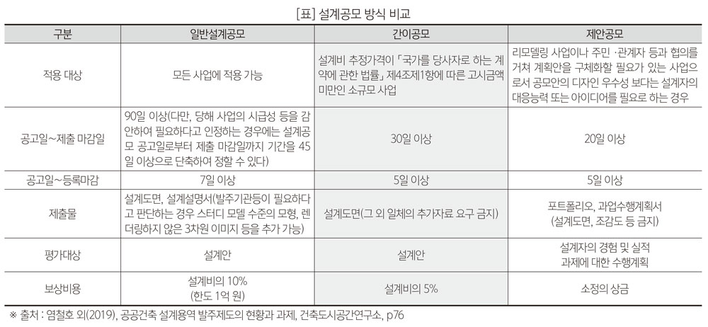 기존 제안공모방식의 적용 대상이었던 소규모 사업은 간이공모라는 새로운 종류의 공모방식을 신설하여 발주기관 및 설계자의 부담을 경감하는 측면에서 제출물은 설계도면으로 한정하고 공모기간은 공모공고일로부터 작품 제출까지 30일 이상으로 운영하는 방식을 고려할 필요가 있다. 또한, 일정한 참가자격을 사전에 부여하는 Long-List 방식 또는 Short-List 방식 도입을 통해 공모 절차를 간소화하거나 공모 참여 비용을 낮추는 제한공모 및 지명공모 방식에 대한 추가고려도 가능하다.