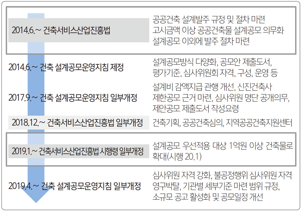 설계공모제도의 현황에 대한 주요내용은 다음과 같다. 「건축 설계공모 운영지침」은 「건축서비스산업 진흥법 시행령」 제17조제5항에 근거하여 2014년 6월에 제정되었다. 이후 2017년 7월에 일부 개정되어 있는데, 그 이유는 설계비 감액지급 관행을 개선하고 심사과정의 공정성·투명성 제고 등 보완이 필요한 사항을 개선하여 공정한 설계공모 질서를 확립, 신진건축사 제한공모 근거를 마련하여 창의적인 디자인을 유도하고 설계의 질을 높여 공공건축의 발전 및 공간문화 창조에 기여하고자 하기 위함이었다. 2019년 4월에는 그간 제도 운영 과정에서 제기된 심사위원 선정, 심사과정 등 공모절차의 투명성 및 전문성을 강화하고자 하였다.