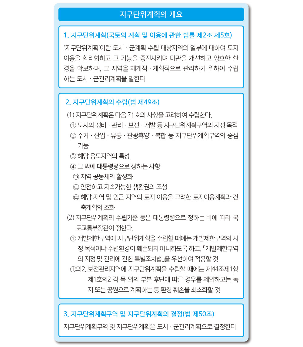 국토계획은 광역계획부터 시작해서 지구단위계획까지 그 규모 및 단위에 따라 다양한 계획이 있다. 국토계획법은 용도지역제 도시계획제도를 통해서 개별적이며 구체적인 건축물의 건축행위를 규제하고 있다. 이 중에서 지구단위계획은 도시지역 안에서 상대적으로 적은 지역단위에 국한하는 도시계획으로서, 보다 상세하고 입체적인 내용을 담고 있다.