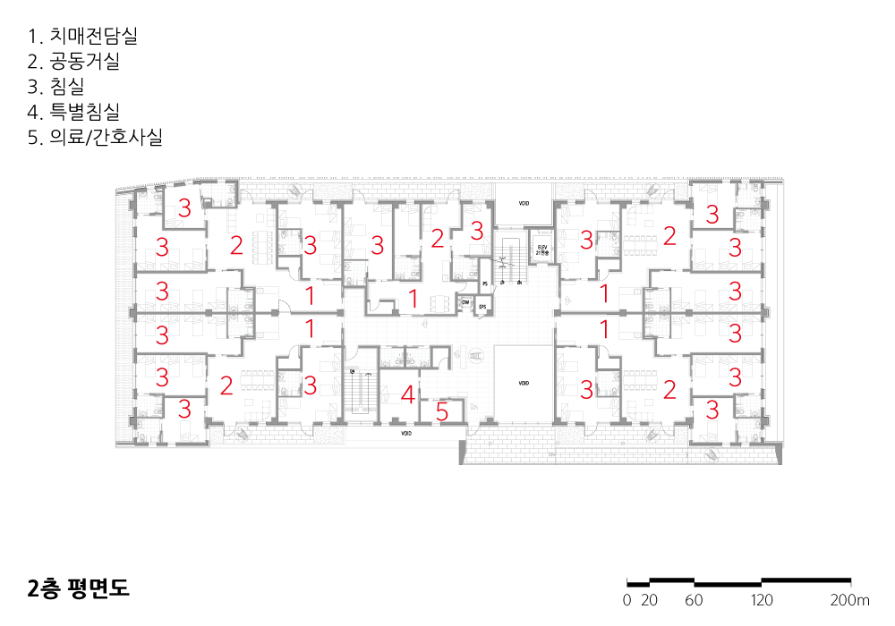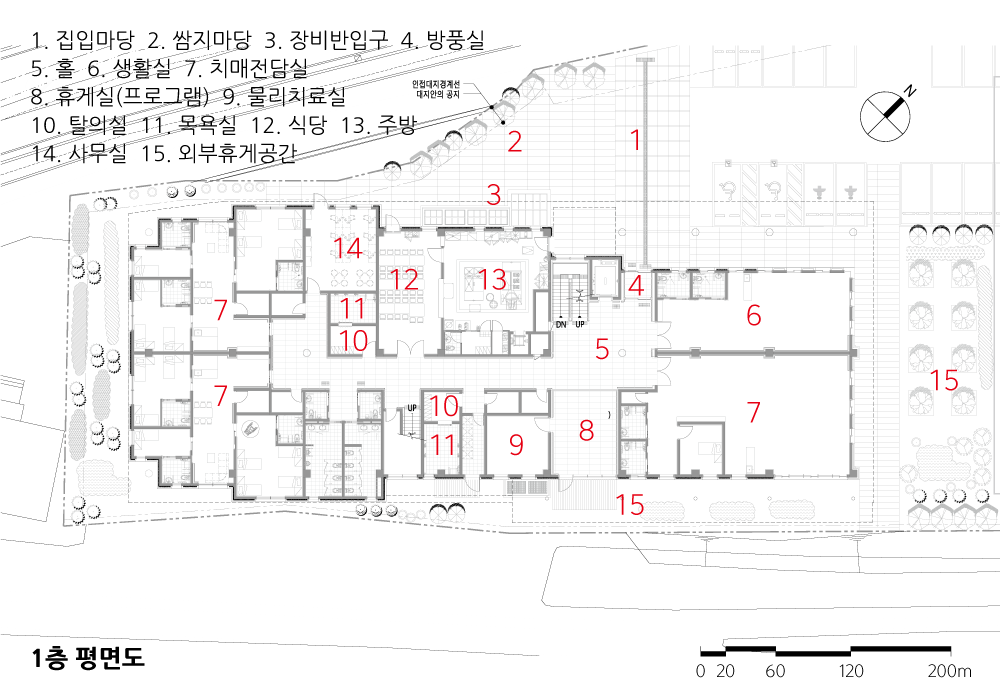 협소한 대지 조건과 밀도 높은 프로그램으로 기능에 충실한 평면을 구성하였다. 로비를 중심으로 각 프로그램을 배치하였고, 주간보호시설은 이용자를 고려하여 드롭존(DROP ZONE)과 별도의 출입구를 계획하였으며 거동이 불편한 노인들을 고려하여 동선을 최소화하였다. 연속되는 실내·외 배회공간을 통해 유기적인 동선의 흐름을 유도하고 치료에도 긍정적 효과를 줄 수 있도록 계획하였다.