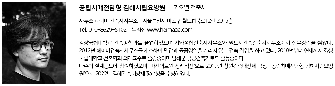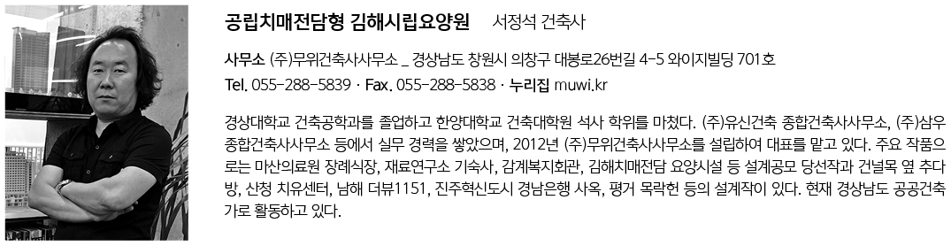 | 공립치매전담형 김해시립요양원 설계자 | 서정석 · 권오열 _ (주)무위건축사사무소 · 헤이마 건축사사무소 건축주 | 김해시장 감리자 | 금창건축사사무소 시공사 | (주)수경종합건설 설계팀 | 김주애, 정재효, 함지헌 대지위치 | 경상남도 김해시 대동면 대동로 62 주요용도 | 노유자시설(노인복지시설) 대지면적 | 3,560.00㎡ 건축면적 | 1,429.21㎡ 연면적 | 2,544.36㎡ 건폐율 | 40.15% 용적률 | 62.92% 규모 | B1F - 2F 구조 | 철근콘크리트구조, 일부철골구조 외부마감재 | 노출콘크리트, 치장벽돌, 알루미늄복합패널, CRC보드 설계기간 | 2019. 08 - 2020. 01 공사기간 | 2020. 09 - 2021. 09 사진 | (주)무위건축사사무소 구조분야 : 광림구조이엔지(주) 전기분야 : 에이스이엔지 기계분야 : 대명엔지니어링 |