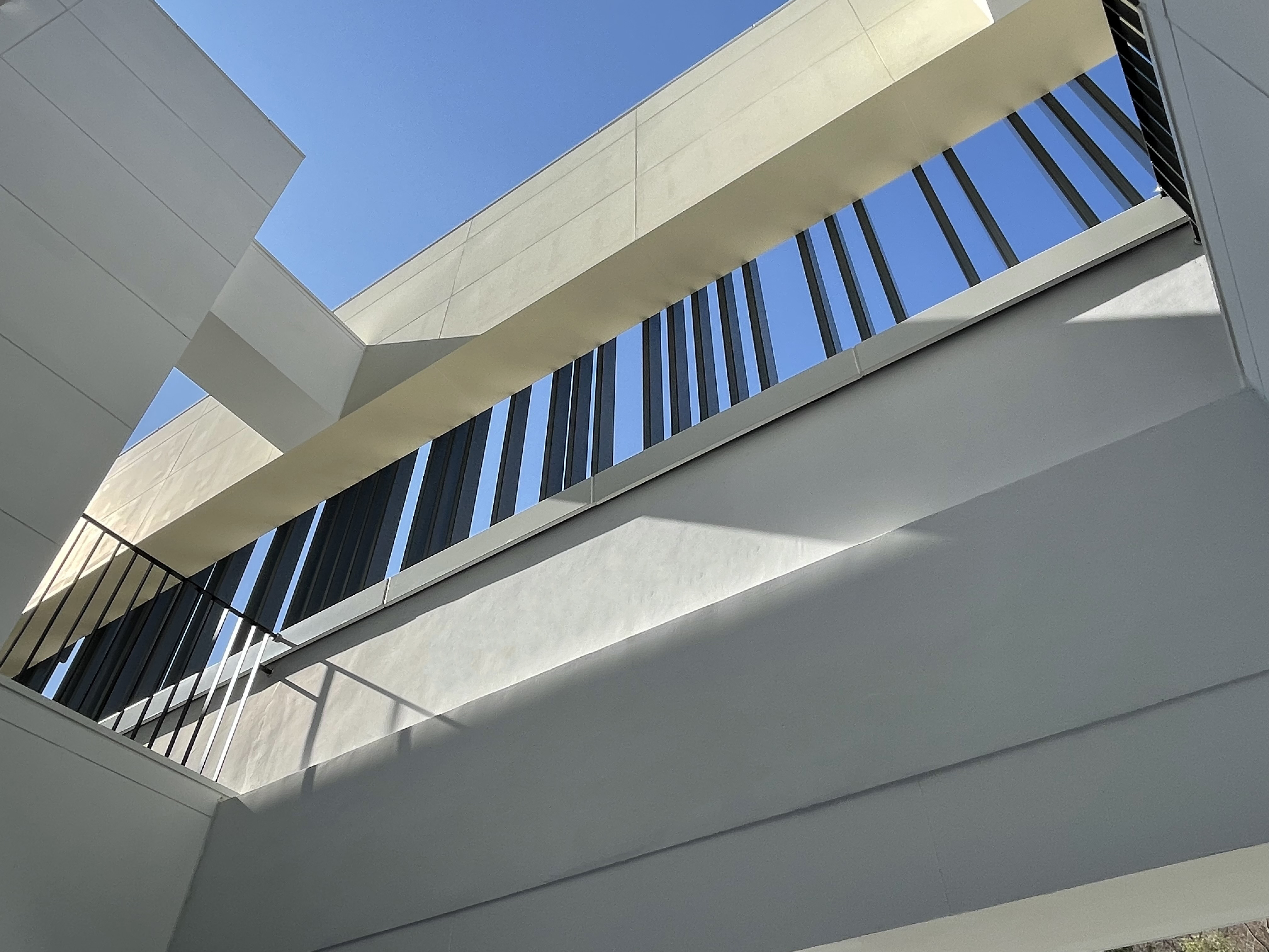돗대산 쪽의 연속된 수직루버는 차량소음과 마을의 시선을 조율한다. 테라스 이용자는 앞산을 바라보며 틈새 사이로 주변 환경을 소유한다.