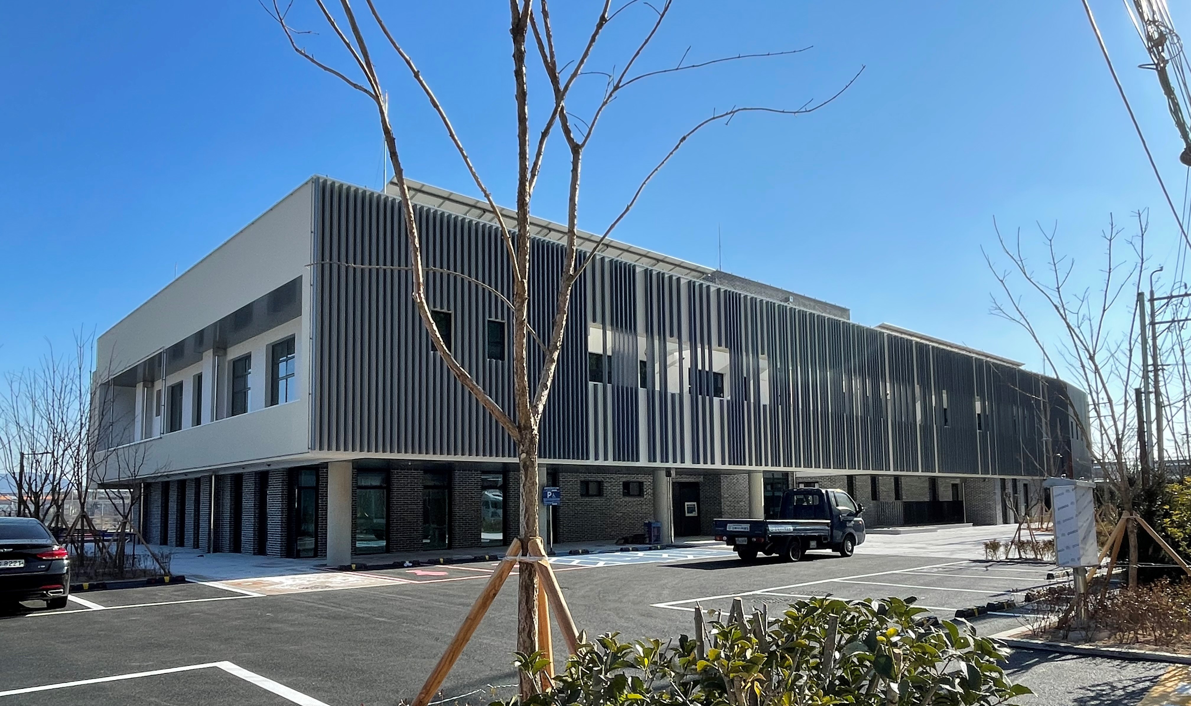 The continuous vertical louvers facing Mt. Dotdaesan mediate between the noise of vehicles and the gaze of the village. Terrace users can secure the surrounding environment through the gaps while looking at the mountain.