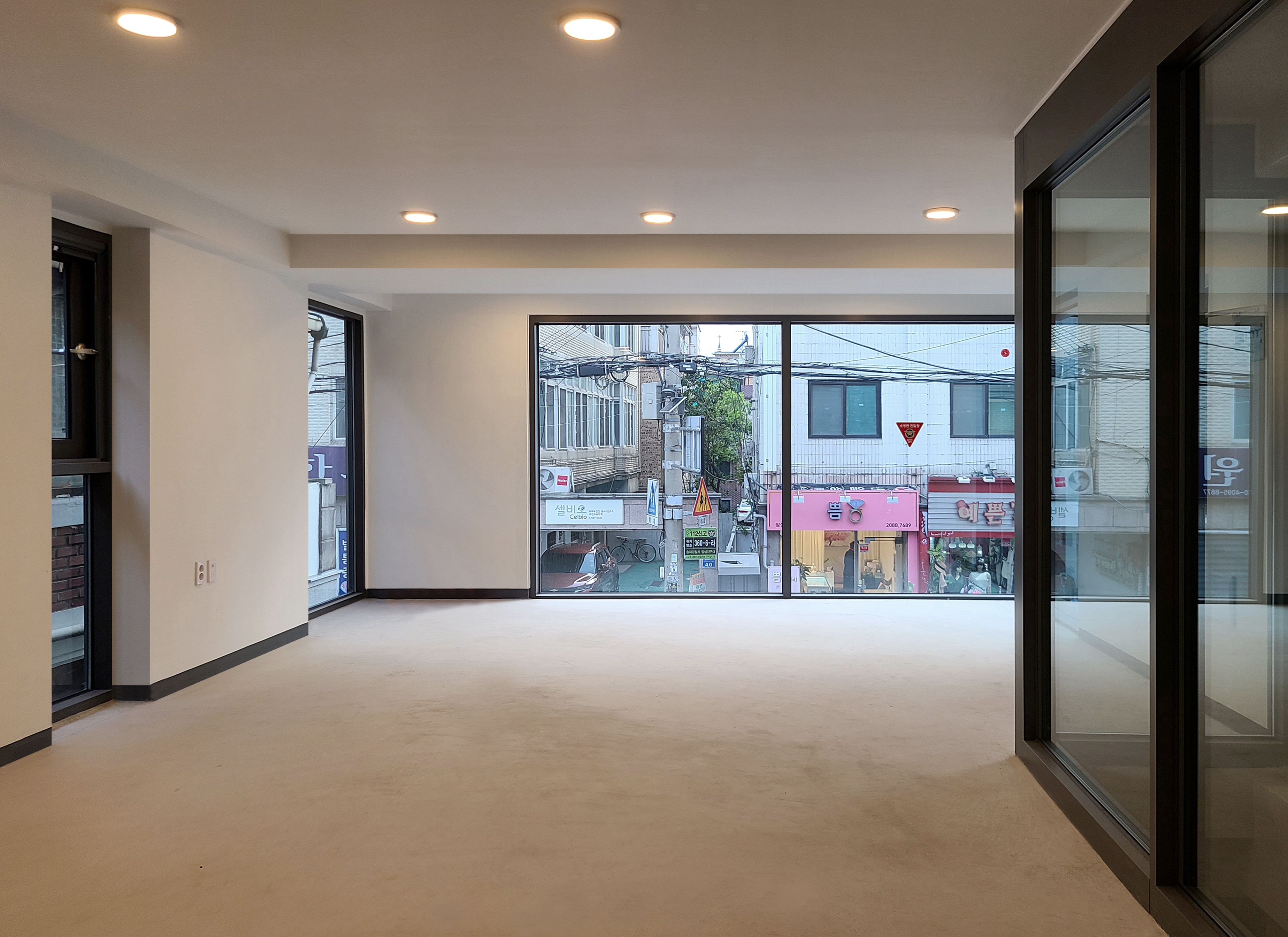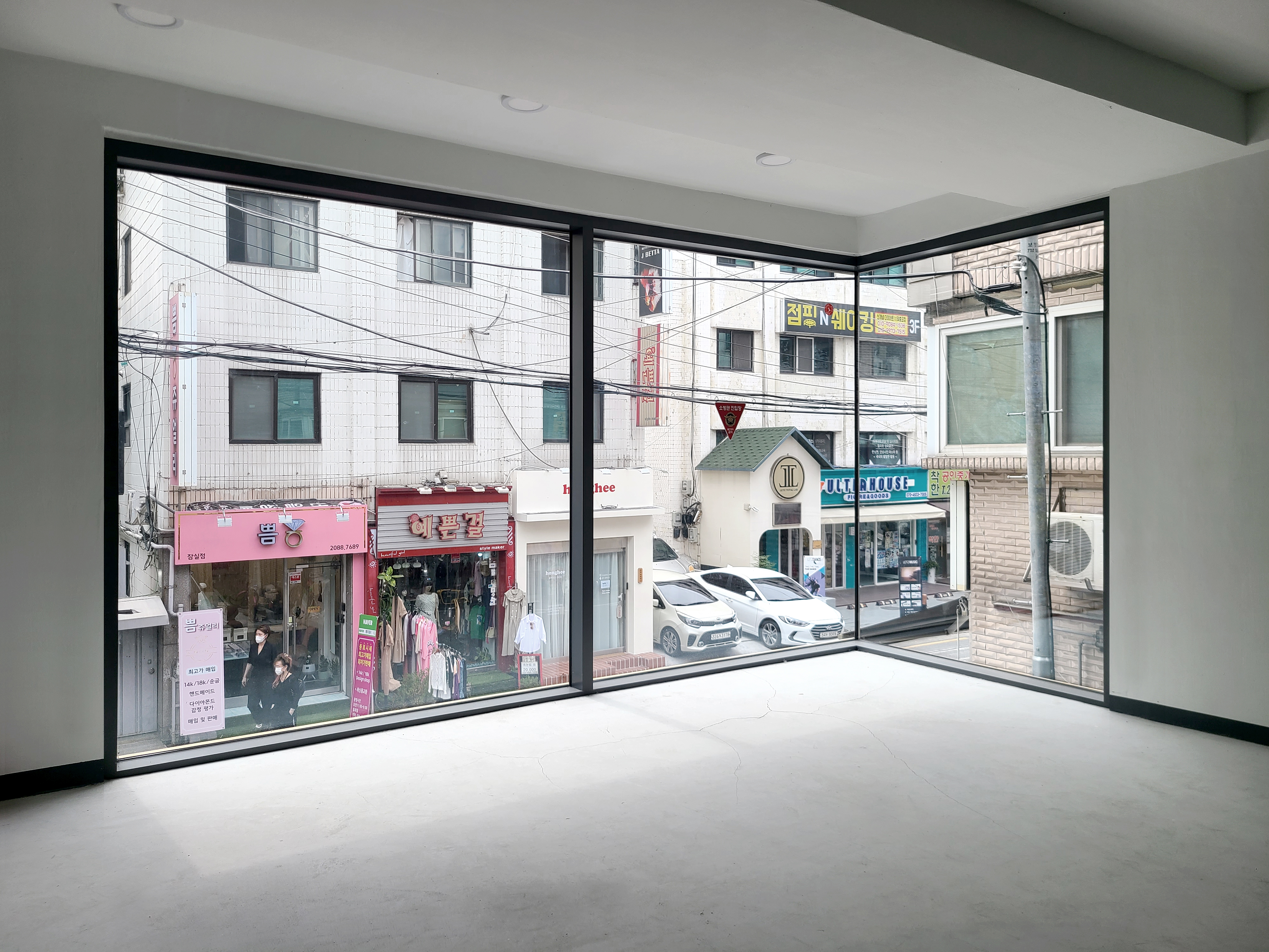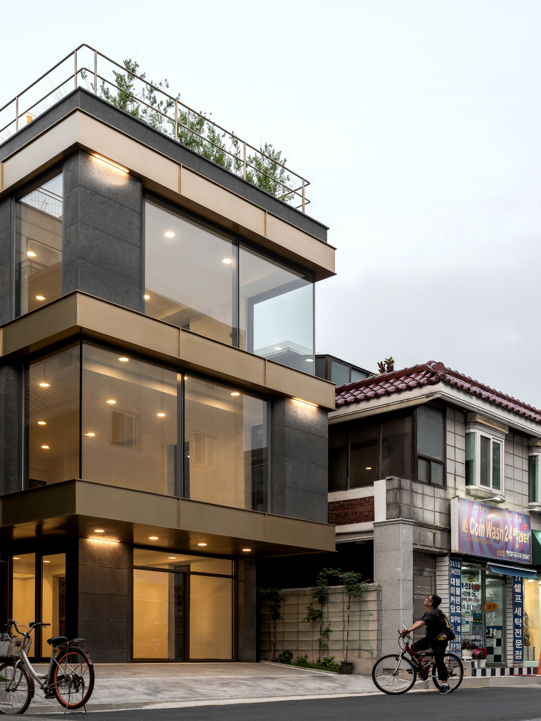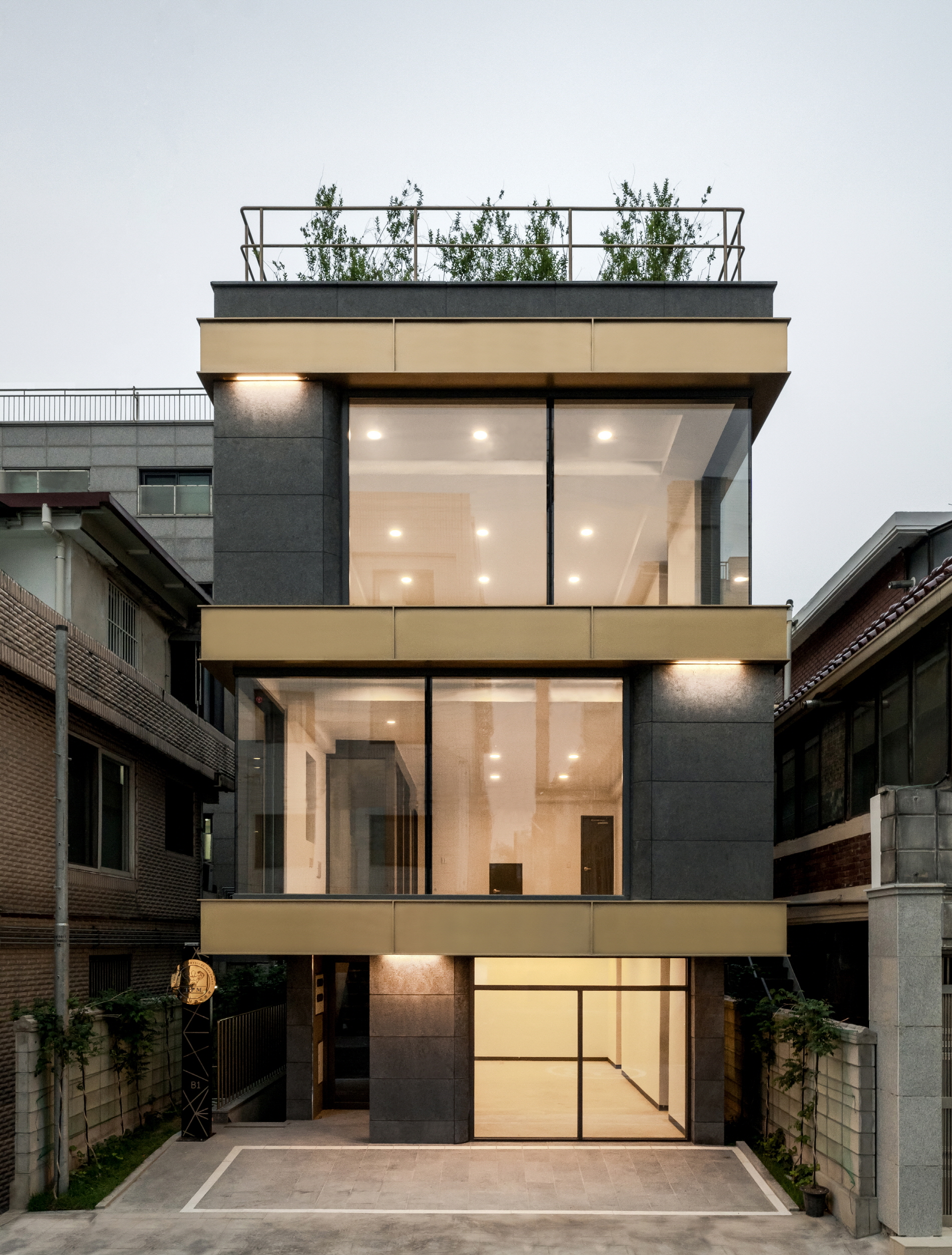 Corner windows were planned on each floor to naturally express the presence of the building day and night in the linear urban context. For everyone to actively permeate and communicate with the linear urban tissue, it was designed to communicate with the landscape inside out and vice versa. To create a rhyme for each floor, even for small gestures, we set the proportions and divisions of planes, as well as solid and transparent. In addition, we aimed to infuse life into the gray city by making it more colorful and refined. However, it is small, through horizontally divided gold furring strips, which are uncommon.