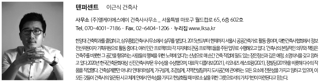 | 텐퍼센트 설계자 | 이근식 _ (주)엘케이에스에이 건축사사무소 건축주 | 김옥란 감리자 | 이근식 _ (주)엘케이에스에이 건축사사무소 시공사 | 피에스엔지니어링(주) 설계팀 | 조명선, 이승준 대지위치 | 서울특별시 송파구 올림픽로12길 39 주요용도 | 근린생활시설 대지면적 | 104.40㎡ 건축면적 | 50.49㎡ 연면적 | 191.62㎡ 건폐율 | 48.36% 용적률 | 135.80% 규모 | B1F - 3F 구조 | 철근콘크리트구조 외부마감재 | 화강석, 철판 도장 내부마감재 | 석고보드 위 도장 설계기간 | 2021. 06 – 2021. 08 공사기간 | 2021. 11 – 2022. 05 사진 | 구의진 구조분야 : 서전 구조엔지니어링(주) |