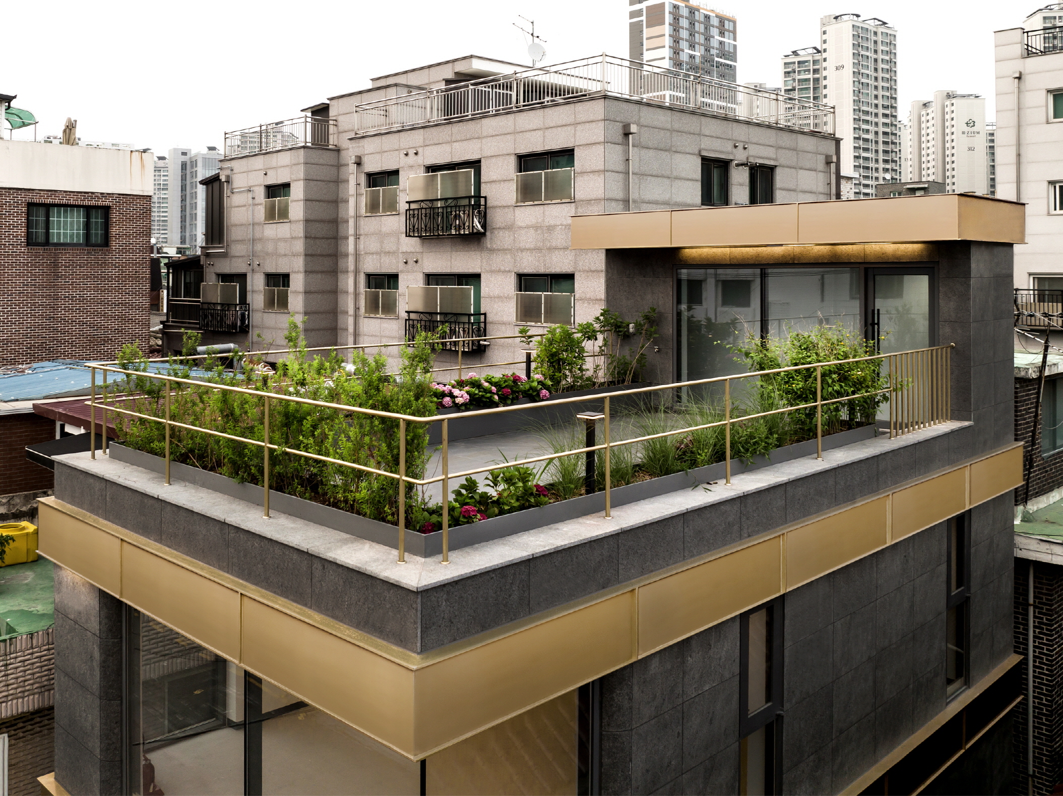 Such an idea extended to rooftop landscaping. It was designed to consider even passers-by so they could feel the seasonal change. When we first encountered the site, it was a pity that there were no trees in linear and block-type urban tissue, but we think that a rooftop landscaping plan would also vitalize the residents who enjoy the space on the 3rd floor. It is meant to nurture something with affection.