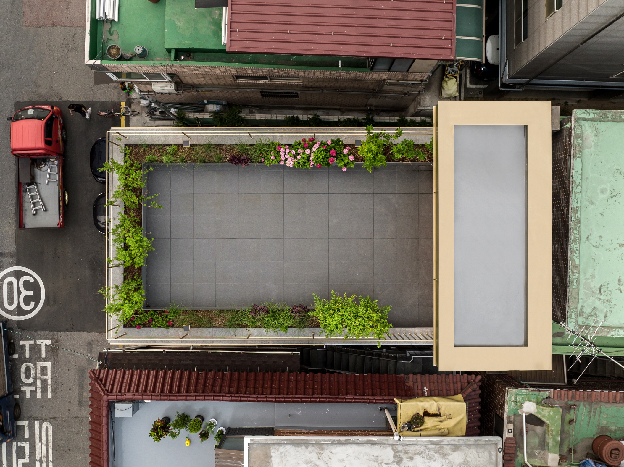 그러한 생각은 옥상의 조경계획까지 연장되었다. 길가를 오가는 사람들까지 계절의 변화를 느낄 수 있도록 배려하고자 하였다. 대지를 처음 접할 때부터 선형과 블록의 도시조직 안에 수목이라고는 찾아볼 수 없었던 것이 아쉬웠는데, 옥상 조경계획은 3층 공간을 향유하는 거주민에게도 삶의 활력을 선사해줄 것이라 생각한다. 무엇인가에 애정을 갖고 가꾸어간다는 것은 의미깊은 일이다.