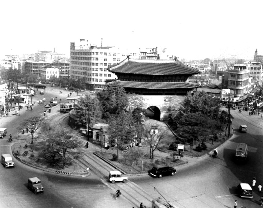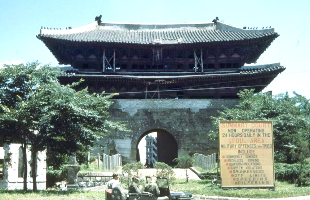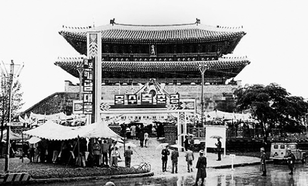 광복을 맞은 숭례문은 한 번 더 큰 위기를 맞는다. 1950년 한국전쟁이 발발한 것이다. 서울은 전쟁의 한복판이 되었고, 폭격과 시가전 속에서 숭례문은 큰 상처를 입는다. 전쟁 중 파손된 부분은 1953년 7월에 이루어진 휴전협정을 전후해서 임시로 보수가 이루어진다. 시멘트로 깨지거나 떨어져 나간 부분을 매우는 수준이었다. 이렇게 전쟁의 위기를 넘긴 숭례문은 1961년부터 1963년까지 1년 10개월, 약 2년간 전면 해체 공사가 이루어진다. 세 번째 재축이다.