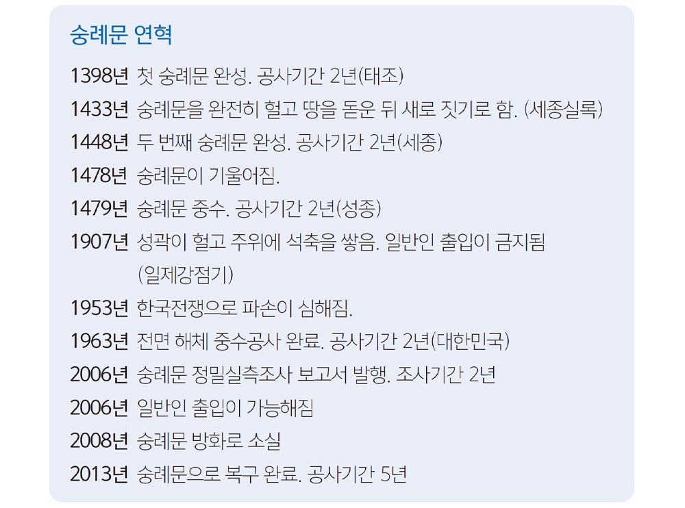 2008년 2월 10일 저녁 8시 40분. 어둠 속에서 그림자 하나가 숭례문으로 다가간다. 그리고 불꽃이 일어났다. 5시간 뒤 2층 목조 누각은 전소되고 1층 누각도 50% 소실되었다. 600년 역사의 숭례문은 그렇게 5시간 만에 무너졌다. 화재 후 5년의 공사기간 동안 숭례문 앞을 지날 때면 안타까운 맘이 컸다. 그래서 지금처럼 재축되어 돌아와 준 것만으로도 숭례문이 더 자랑스럽다. 특히 지어진지 20∼30년 정도 지나면, 여러 가지 이유로 재개발, 재건축 이야기가 나오는 대한민국이기 때문에 더 그런 생각이 들었는지 모르겠다. 문득 ‘조선시대에도 숭례문의 재축이 있었을까?’하는 궁금증이 생겼다. 확인해보니, 조선시대에도 두 번의 큰 보수공사가 있었는데, 한 번은 전면 해체 후 지반공사까지 보완한 세종 때의 중수重修(1448)이고, 두 번째는 누각이 기울어 새로 고쳐지은 성종 때의 중수重修(1479)였다. 조선 초기 80년 정도의 짧은 기간 동안, 신축(1398) 후 두 번의 재축이 있었던 것이다. 조선 건국 시점부터 지금의 대한민국 시기까지 약 630년간 숭례문 부활의 역사를 짚어 보자.
