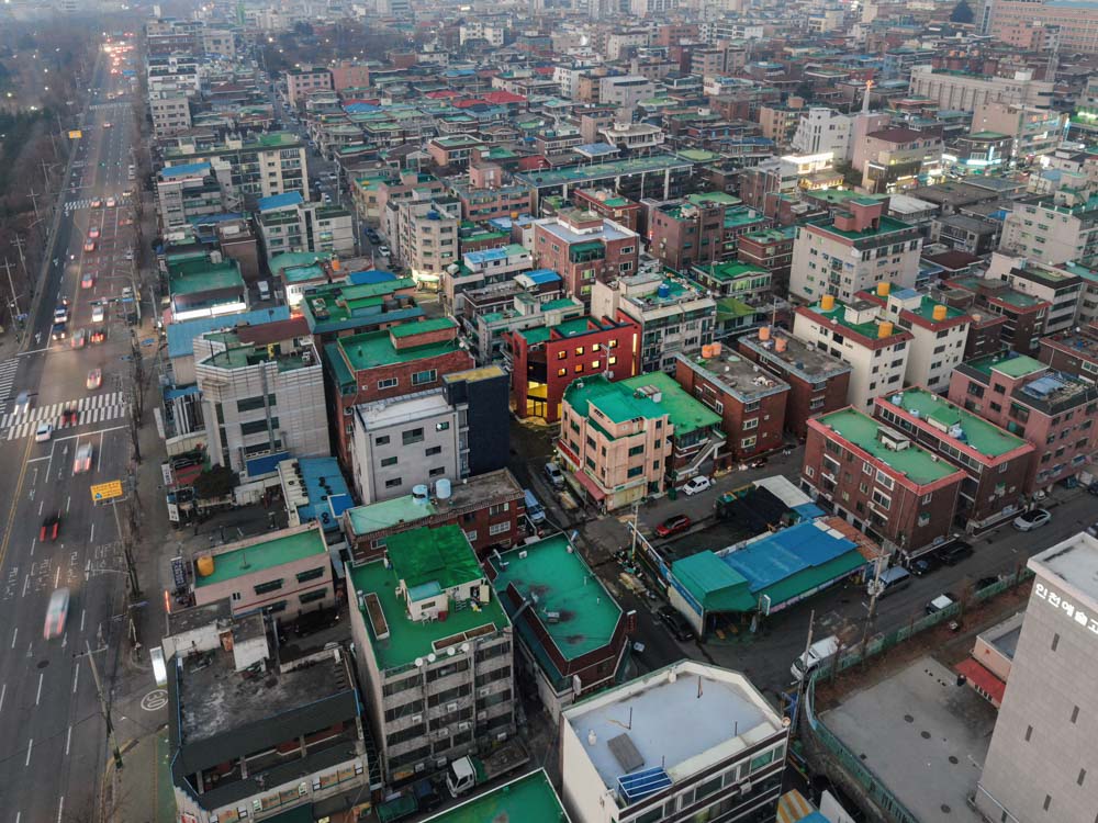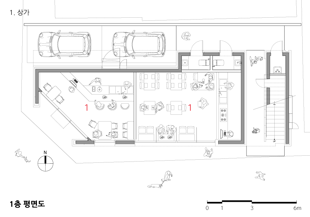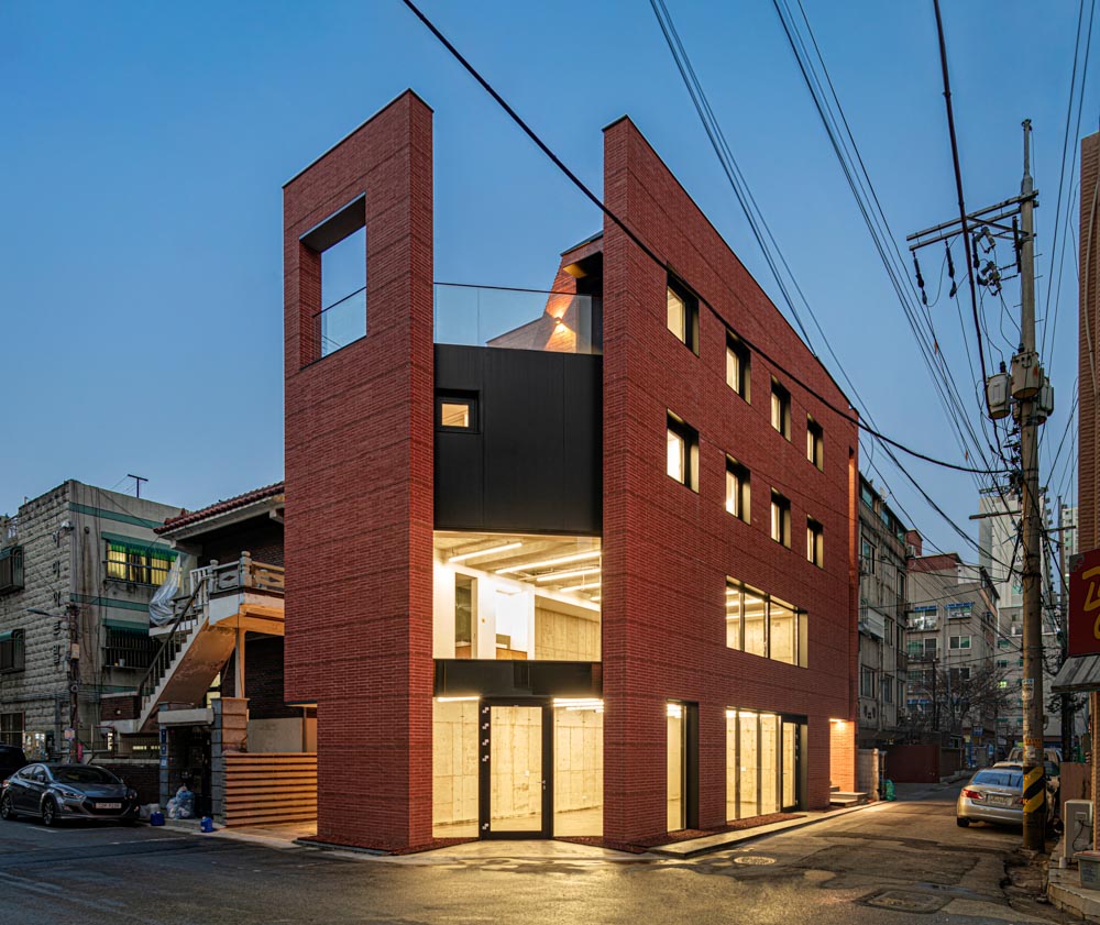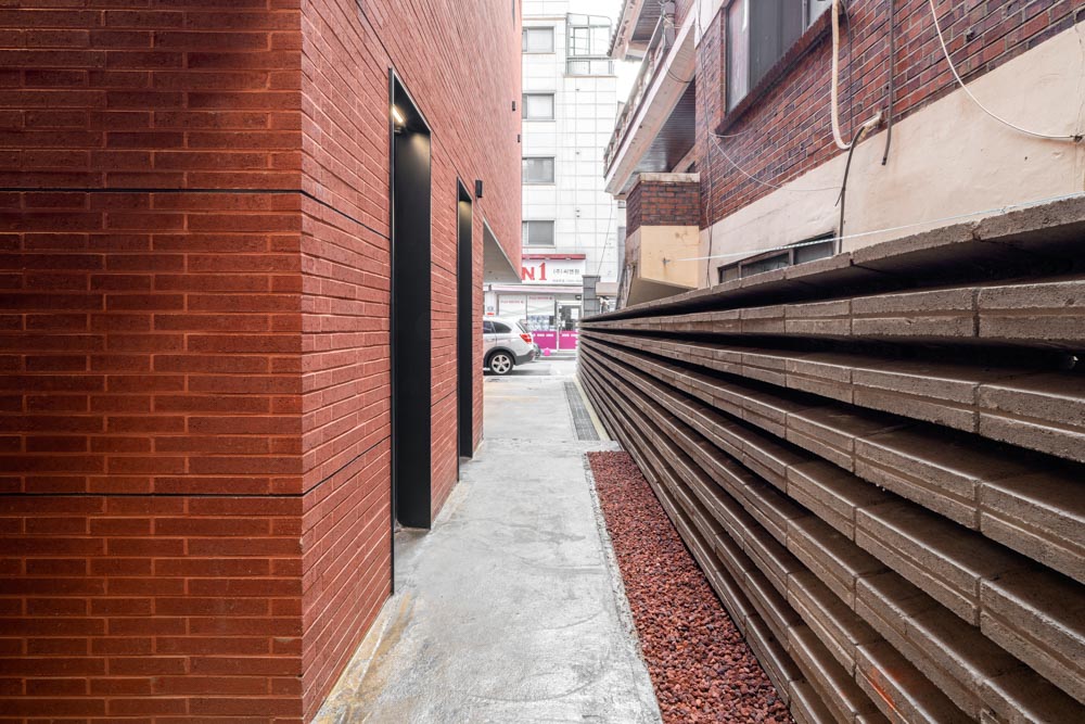 Small buildings in Korea are often shaped by building codes and regulations. As the property was cut off with corners of 18m X 8.4m, the size and shape of the building were determined under the highest priority of ensuring maximum floor area ratio (FAR) and maximum building coverage ratio (BCR). According to the building regulations, three-story building can be built on this property, but surrounded buildings were five-story buildings which were built back in 70's and 90's. If a small three-story building sits here based on building regulations, an independent building will be created which ignores the entire context of the city.