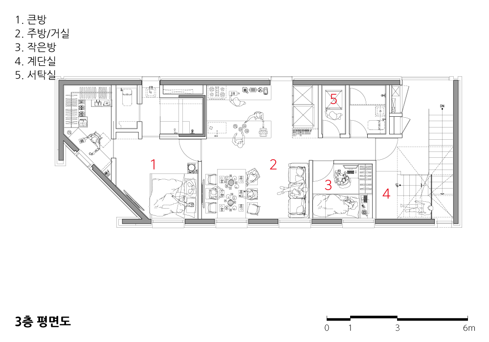 건축법에 의하면 대지는 일반적으로 3층 규모의 건축물을 지을 수 있는 땅이다. 그리고 그 주변으로 1970~1990년대에 만들어진 오래된 5층 규모의 건축물들이 둘러싸고 있다. 이곳에 건축법에 의해 3층짜리 작은 건물이 들어선다면 도시의 전체 맥락을 무시하는 독자적인 건물이 탄생할 것이다. 이러한 문제점을 해결하기 위해 역으로 건축법을 이용하는 것이 이번 프로젝트의 목표였다. 결과적으로 ‘Three Planes, Five Layers’라는 개념으로 건축의 기능, 구조, 미를 통합할 수 있었다.