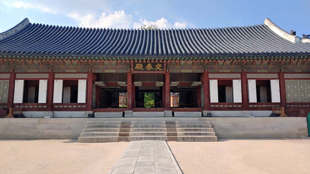 경복궁의 중심 건물은 근정전(국보 223호)이지만, 혈처(穴處)는 교태전(交泰殿)인데 궁의 내전으로 왕비가 거처하던 침전이다. 교태전이라는 명칭은 주역(周易)의 64괘 중 태(泰)괘에서 따온 것인데 괘의 형상은 위로는 곤(坤)이고 아래는 건(乾)이 합쳐진 모양이다. 지천태(地天泰), 즉 땅과 하늘의 기운이 조화롭게 화합하여 만물이 생성한다는 의미를 담고 있다. 이 건물엔 용마루가 없다. 왜냐하면 왕자를 생산하는 곳이기에 하늘의 기운을 받는데 방해가 되기 때문이다. 여기서 재미있는 것은 위가 땅(곤)이고 아래가 하늘(건)로 바뀐다는 점이다. 이것은 여성 상위를 뜻함이다. (사진 2)