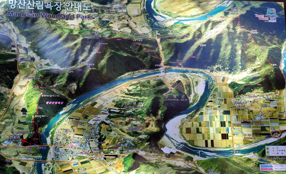 영월의 주천면은 산(망산 등)의 능선과 강물(주천강)의 곡선이 동심원을 이루는 형국이며 물이 궁수(弓水)로 환포하고 있어 받아들이고 얻어내는 형상으로 모든 것을 내 편으로 만드는 지형이다. (사진 5)