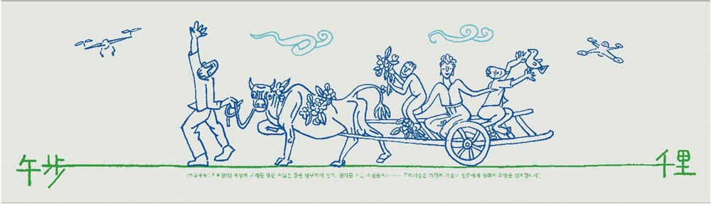 이중섭의 ‘길 떠나는 가족’이 친한 아트디렉터의 손에서 새로운 모습으로 탄생했다. 우보천리(牛步千里)를 회사의 모토로 삼고 있는 회사의 벽면 디자인이다. 소의 해, 2021년에 참 잘 어울리는 그림이다.