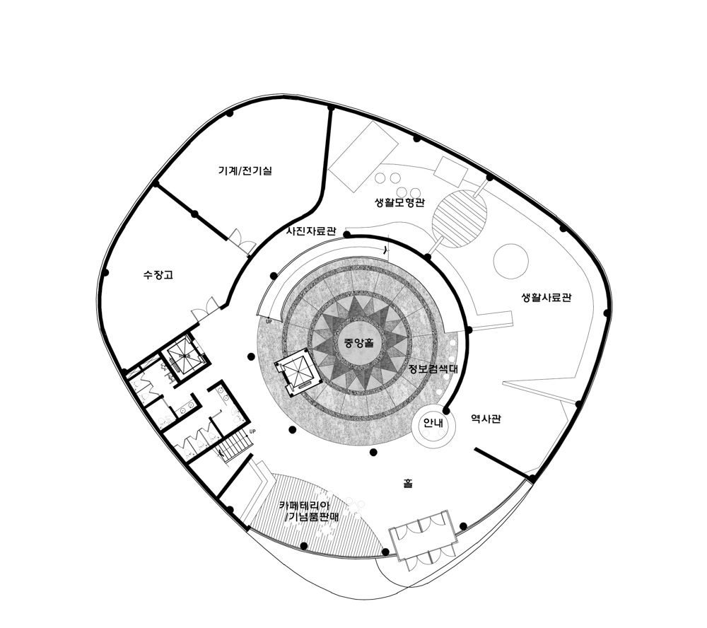 따라서 입면계획도 이와 같은 문화를 바탕으로, 자연과 방문객이 건축과 소통하는 방식을 택했다. 경사진 대지를 그대로 활용한 계획은 주변의 자연경관과 조화를 이루는 건축을 구현하면서 자연스럽게 다양한 토속적 외부공간을 형성하여 관람객들과 소통을 이루었다.