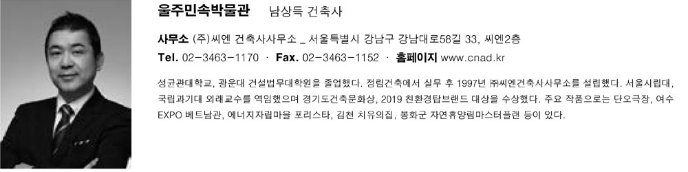 | 울주민속박물관 설계자 | 남상득_(주)씨엔 건축사사무소 건축주 | 울주군청 감리자 | (주)한림이앤씨 건축사사무소 시공사 | (주)일원종합건설 설계팀 | 백유미, 이승환, 김희수 대지위치 | 울산광역시 울주군 온양읍 옹기문화공원 주요용도 | 전시장 대지면적 | 4,240.00㎡ 건축면적 | 843.73㎡ 연면적 | 1,361.14㎡ 건폐율 | 19.90% 용적률 | 28.88% 규모 | 지하 1층, 지상 2층 구조 | 철근콘크리트조 외부마감재 | 알미늄시트, 로이복층유리 내부마감재 | 화강석, 목재, 수성페인트 사진 | 이남선 _ 엘투아카이브 구조분야 : 서울구조 E&C(주) 기계설비분야 : (주)성문엔지니어링 전기분야 : (주)덕수엔지니어링 |
