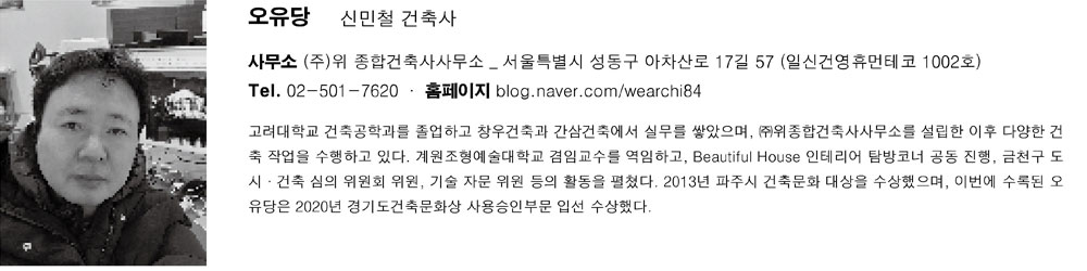 | 오유당 설계자 | 신민철 _ (주)위 종합건축사사무소 건축주 | 유병옥, 박순옥 감리자 | 신민철 _ (주)위 종합건축사사무소 시공사 | 자기도급 대지위치 | 경기도 양평군 서종면 퉁점길 23-1 주요용도 | 단독주택 대지면적 | 1,963.00㎡ 건축면적 | 116.40㎡ 연면적 | 188.42㎡ 건폐율 | 5.93% 용적률 | 9.60% 규모 | 지상 2층 구조 | 철근콘크리트구조 외부마감재 | 파벽돌, 큐블록 내부마감재 | 대리석, 벽지 설계기간 | 2019. 05 ~ 2019. 06 공사기간 | 2019. 07 ~ 2019. 12 사진 | 원준경 구조분야 : 선린구조기술사사무소 기계설비분야 : 해원기술 전기분야 : 청효하이텍 소방분야 : 해원기술 |