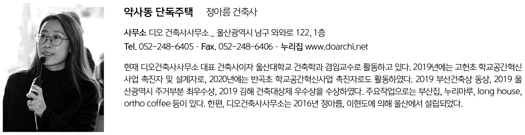 | 약사동 단독주택 설계자 | 정아름 _ 디오건축사사무소 건축주 | 오아름, 문정호 감리자 | 정아름 _ 디오건축사사무소 시공사 | 디오건축 설계팀 | 이현도, 최지현 설계의도 구현 | 디오건축사사무소 대지위치 | 울산광역시 중구 종가30길 26 주요용도 | 단독주택 대지면적 | 313.40㎡ 건축면적 | 120.52㎡ 연면적 | 199.72㎡ 건폐율 | 38.46% 용적률 | 63.73% 규모 | 2F 구조 | 철근콘크리트구조 외부마감재 | 스타코(외단열시스템), 시멘트벽돌타일, 이플러스창호 내부마감재 | 실크벽지, 자작나무, 포셀린타일 설계기간 | 2019. 08 – 2020. 08 공사기간 | 2020. 08 – 2021. 03 사진 | 윤준환 구조분야 : (주)제네럴구조엔지니어링 기계설비분야 : 금강디엔에스(주) 전기분야 :(주)보명엔지니어링 소방분야 : (주)보명엔지니어링 |